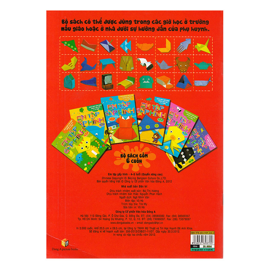 Tập gấp hình bằng giấy là một trò chơi thú vị mà các bậc phụ huynh thường chơi cùng con. Bé sẽ rất thích thú khi chính tay xếp được những hình ngộ nghĩnh, dễ thương như con thuyền, bông hoa hay ngôi nhà… Tuy nhiên, không phải cha mẹ nào cũng biết nhiều cách gấp hình để hướng dẫn con hàng ngày. Hiểu được điều đó, Công ty Văn hóa Đông A đã xuất bản bộ sách dạy gấp hình cho trẻ từ 3 – 6 tuổi "Em tập gấp hình" Bộ sách không chỉ là cẩm nang gấp hình cho các bậc phụ huynh mà còn có thể dùng trong các giờ học ở trường mẫu giáo.