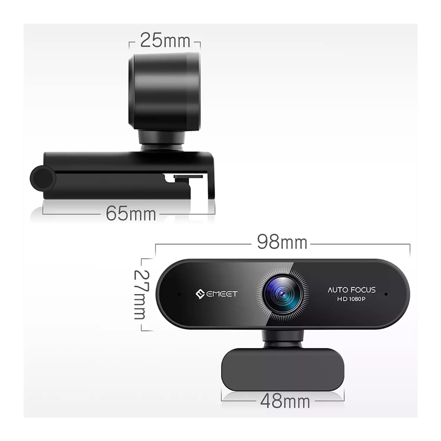 - Sách thông tin sản phẩm. THÔNG SỐ KỸ THUẬT Focus type Auto focus Built-in microphone Omnidirectional stereo microphone *2 Viewing angle 96 degrees Maximum resolution 1080p/30fps Height x Width x Depth 98mm x 65mm x 48mm Tripod compatible universal clip (notebook computer, LCD /For monitor) Cable length 1.5m Compatibility Windows 10 or later, Windows 8, Windows 7, Mac OS 10.10 or later, Android 5.0 or later, Chrome OS USB port keyword: webcam họp trực tuyến, webcam học online, webcam hội nghị, webcam skype, webcam emeet, emeet nova.