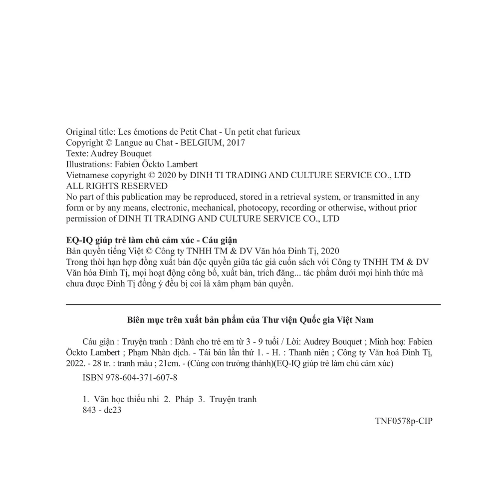 Để trả lời câu hỏi đó, Đinh Tị Books xin giới thiệu với bạn đọc bộ sách EQ-IQ giúp trẻ làm chủ cảm xúc được tác giả người Pháp Audrey Bouquet viết theo phương pháp tâm thể (sophrology) rất phổ biến ở châu Âu. Bộ sách gồm 8 cuốn với minh họa dễ thương sẽ kể cho các em nghe câu chuyện của bạn Mèo con ngộ nghĩnh, lồng ghép vào đó những bài học, lời khuyên và giải pháp để các em biết cách đối diện với nỗi sợ, nỗi lo lắng, cơn giận, niềm vui cũng như nhiều cảm xúc khác nữa.