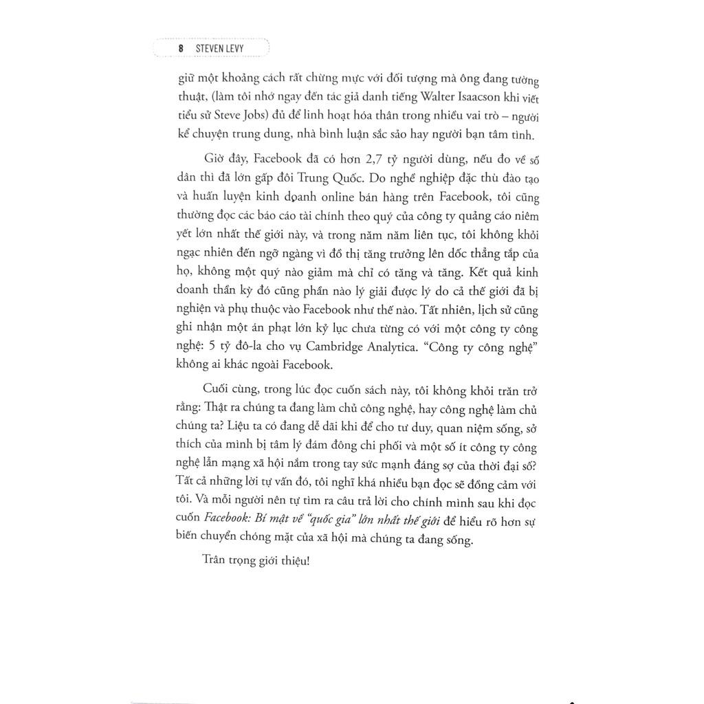 Cuốn sách nói về sự hình thành và phát triển của Facebook cùng những khó khăn, thách thức mà công ty này từng phải trải qua. Trong năm thứ hai đại học, Mark Zuckerberg đã tạo ra một trang web đơn giản hoạt động như một mạng xã hội trong khuôn viên trường. Trang này được đón nhận vô cùng mạnh mẽ và rất nhanh sau đó sinh viên trên toàn quốc đã đăng ký sử dụng Facebook. Từ một trang web đơn giản ban đầu, Mark Zuckerberg cùng đội ngũ đã nghiên cứu và phát triển thêm nhiều tính năng và ứng dụng cho Facebook, có những tính năng được đón nhận nhưng cũng có những tính năng thất bại và nhanh chóng biến mất sau đó. Và khi Facebook phát triển cũng là lúc các đối thủ cạnh tranh bắt đầu xuất hiện như Instagram, Snapchat… Cuốn sách cũng đưa ra thông tin về những cuộc đàm phán mua lại các công ty này của Zuckerberg. Càng phát triển mạnh mẽ, Facebook càng phải đối mặt với nhiều thách thức, khó khăn khi gặp phải những cáo buộc liên quan đến việc Facebook là nhân tố góp phần tác động vào kết quả của cuộc tranh cử tổng thống Mỹ năm 2016 giữa Donald Trump và Hillary Clinton khi công ty này không xử lý được việc những tin giả lan truyền trên Facebook và những hacker sử dụng nó để đánh cắp thông tin, cùng vụ bê bối dữ liệu Cambridge Analytica. Tác giả cũng đưa ra những thông tin về cách xử lý của Facebook cũng như Mark Zuckerberg đối với tin giả mạo, việc xử lý dữ liệu thông tin của người dùng cũng như kiểm duyệt nội dung. Đánh giá của chuyên gia, tổ chức uy tín về cuốn sách cùng các giải thưởng Một trong những cuốn sách về công nghệ hay nhất năm 2020 – Financial Times “Câu chuyện lịch sử toàn diện và hấp dẫn.” – The Wall Street Journal “Một câu chuyện mới mẻ, đầy tính cập nhật và nội bộ.” – The Economist Levy miêu tả một công ty công nghệ nơi không có ai chịu trách nhiệm về những gì nó đã phát hành… Cuốn sách khép lại với sự công nhận rằng Facebook đang đi trước với những sáng tạo mới – từ việc Facebook kết hợp với dự án tiền tệ kỹ thuật số Libra – trong khi Zuckerberg tiếp tục bác bỏ bất kỳ câu hỏi đạo đức nào về hành vi trong quá khứ của mình. ” – Financial Times Giá trị của cuốn sách này nằm ở chỗ nó tập hợp tất cả các vấn đề về quyền riêng tư, thuật toán của Facebook và vụ Cambridge Analytica. ” – Library Journal