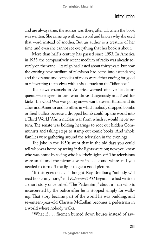 Guy Montag enjoyed his job. He had been a fireman for ten years, and he had never questioned the pleasure of the midnight runs nor the joy of watching pages consumed by questioned anything until he met a seventeen-year-old girl who told him of a past when people were not afraid.