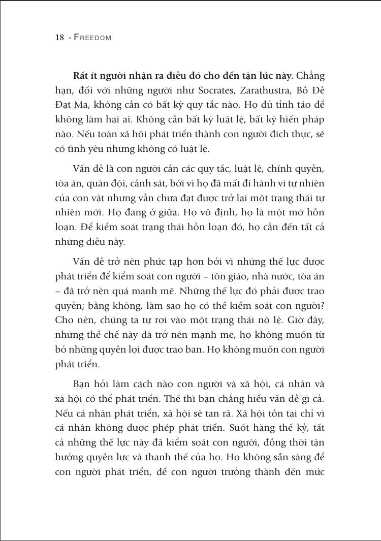 Trong “Tự do – Như chim tung cánh”, Osho bàn đến một trong những vấn đề quan trọng nhất đối với tâm thức con người: tự do. Trong suốt chiều dài lịch sử, con người luôn kêu đòi tự do, luôn đấu tranh vì tự do. Đó có phải là tự do mà Osho nói đến không? Bản chất của tự do là gì?