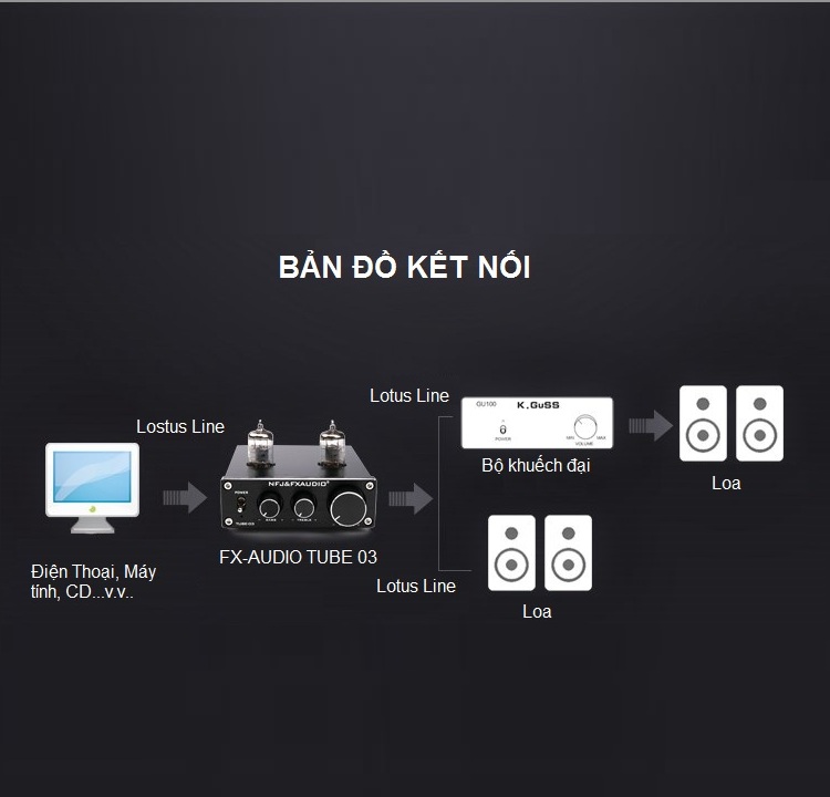 – Thứ tự kết nối Nguồn phát >>> FX Audio TUBE-01 6J1 >>> Amp >>> Loa. Sau khi kết nối Bạn để FX Audio TUBE-01 6J1 hoạt động khoảng 5 phút để bóng 6J1 nóng lên & có được chất âm tốt nhất