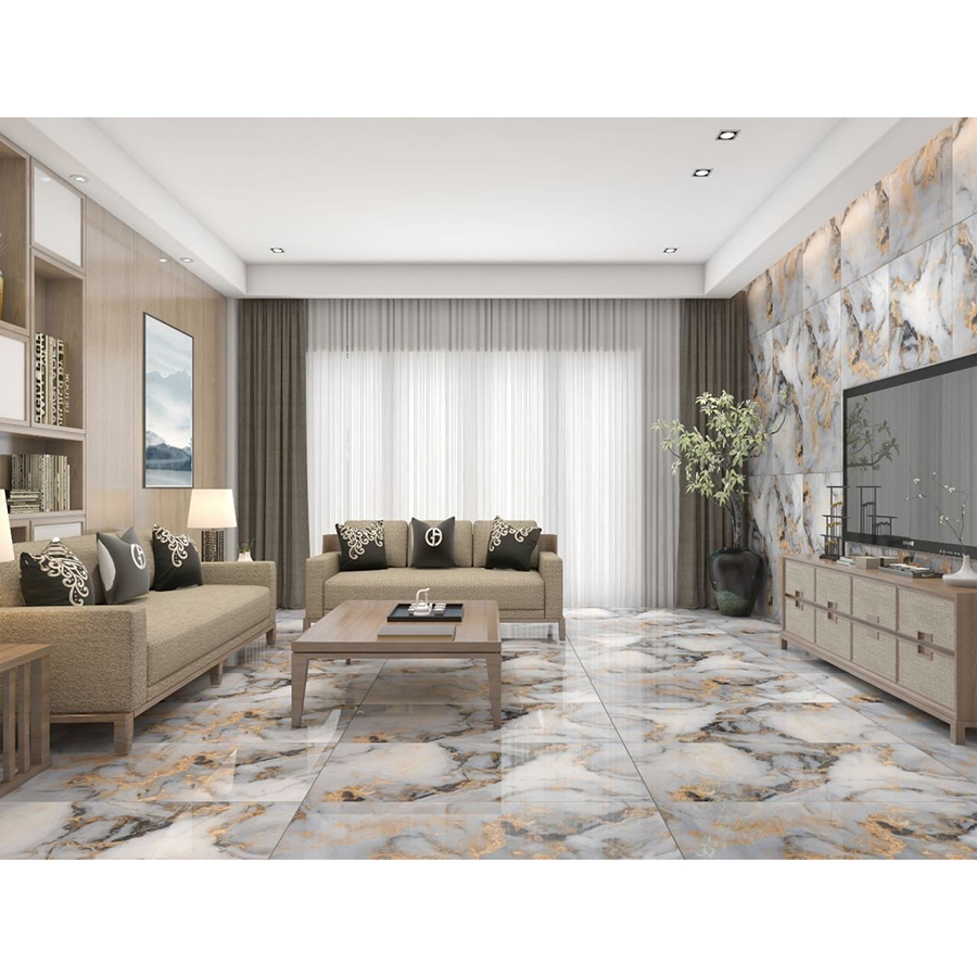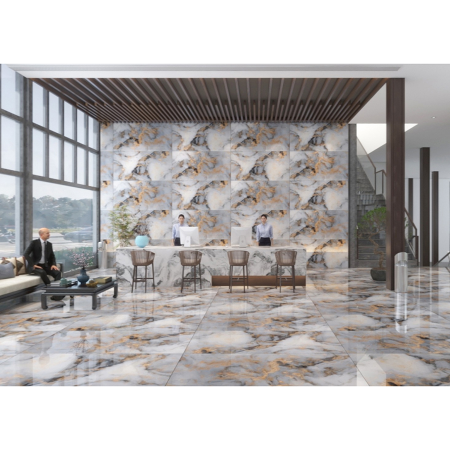 - Loại gạch này có nền màu trắng với các vân đá tự nhiên tạo hình giống với đá cẩm thạch giúp tôn lên nét sang trọng và hiện đại của công trình. Các đường vân và vệt màu có sự pha trộn giữa các màu sắc khác nhau như màu đồng và màu đen tạo nên một bề mặt hoa văn độc đáo và đẹp mắt. Bên cạnh đó, nền màu trắng tạo ra sự phản quang giúp tăng ánh sáng và mang lại cảm giác thoáng đãng cho không gian căn phòng. Do đó, loại gạch lát nền này phù hợp để ốp tường hoặc lát sàn tại các công trình trang trọng như văn phòng, trung tâm thương mại, cơ quan hành chính,