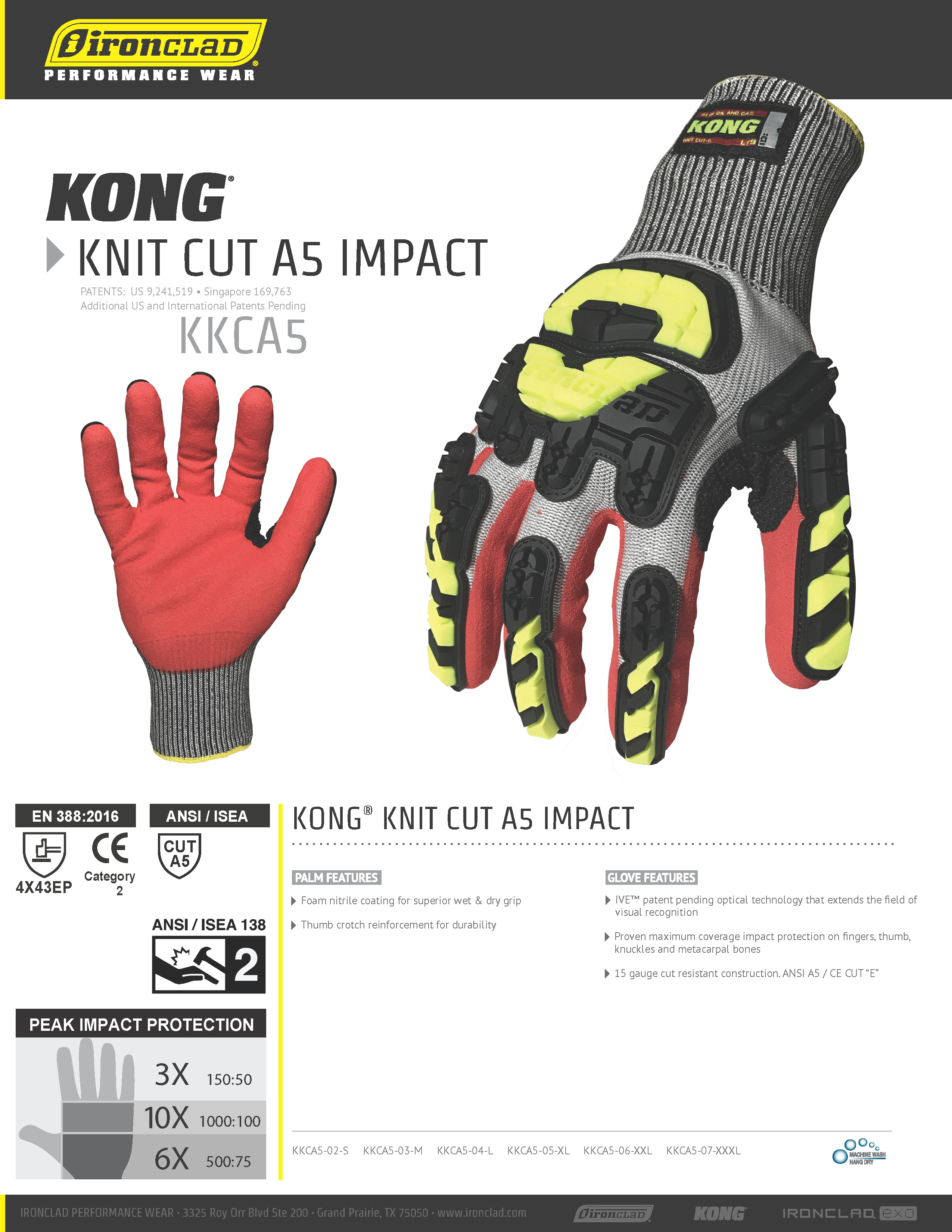 Mua tại TiktokGĂNG TAY KONG CHỐNG CẮT, CHỐNG VA ĐẬP CHÍNH HÃNG - CODE KKCA5 HÃNG: IRONCLAD KONG KNIT ABRASION C5 KKCA5 Standard: EN 388:2016 (4X43EP), ANSI 105 (CUT A5) IVE PATENT PENDING OPTICAL TECHNOLOGY THAT EXTENDS THE FIELD OF VISUAL RECOGNITION Proven maximum coverage impact protection on fingers, thumb, knuckles and metacarpal bones 15 GAUGE CUT RESISTANT CONSTRUCTION. ANSI A5 / CE CUT “E” Foam nitrile coating for superior wet & dry grip Thumb crotch reinforcement for durability