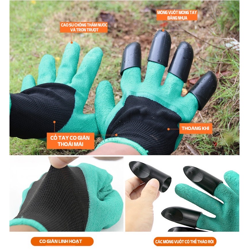 Găng tay làm vườn có móng vuốt để cào ,bới đất ,chăm sóc cây , chống thấm nước , bảo vệ tay khỏi đất bẩn ,các hóa chất từ phân bón , thuốc trừ sâu , diệt cỏ tránh tổn thương do va chạm với vật sắc nhọn , cành cây, co giãn đàn hồi tốt , dễ vệ sinh -Găng tay làm vườn có móng vuốt để cào ,bới đất ,chăm sóc cây , chống thấm nước , bảo vệ tay khỏi đất bẩn ,các hóa chất từ phân bón , thuốc trừ sâu
