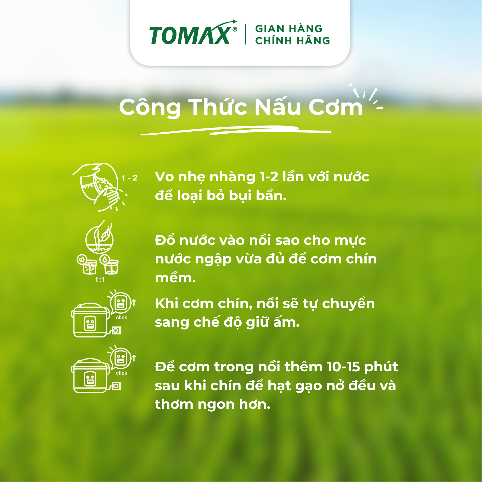 Gạo hữu cơ Tomax 100% không có chất bảo quản, không có chất chống mọt, chống nấm, chất tẩy trắng an toàn tuyệt đối cho người sử dụng. Giá trị dinh dưỡng trong mỗi hạt