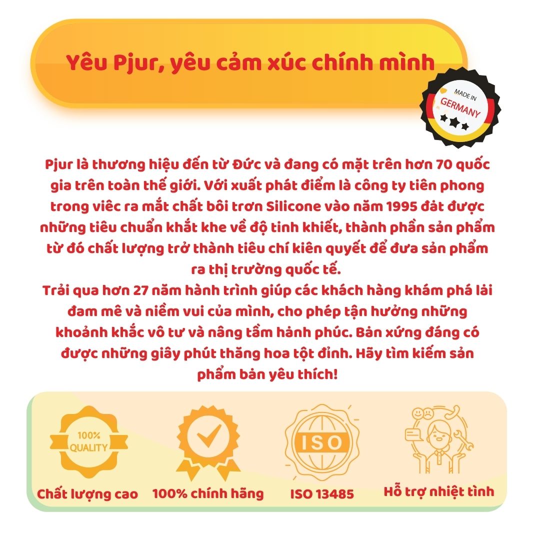 Mua tại TiktokGel bôi trơn gốc nước Pjur Aqua 2ml không chứa chất béo, dầu hoặc nước hoa dưỡng ẩm bao vệ da THÔNG TIN NHÃN HÀNG: Pjur là nhãn hàng của Đức dẫn đầu về việc cung cấp các sản phẩm thân mật cao cấp cho cả nam và nữ. Với bề dày thương hiệu trải qua hơn 27 năm thành công, tất cả các sản phẩm đều được kiểm nghiệm da liễu và đáp ứng các yêu cầu nghiêm ngặt do các tổ chức quốc tế như FDA của Hoa Kỳ, TGA của Úc và Liên minh Châu Âu đặt ra. Sứ mệnh của Pjur là truyền cảm hứng, nâng niu cảm xúc người dùng trong mỗi lần thân mật. Tất cả các sản phẩm bôi trơn của Pjur đều là sản phẩm y tế cao cấp và hoàn toàn an toàn để sử dụng cùng bao cao su latex mang đến cảm giác thăng hoa trong mỗi cuộc yêu. Pjur là nhãn hàng của Đức dẫn đầu về việc cung cấp các sản phẩm thân mật cao cấp cho cả nam và nữ. Với bề dày thương hiệu trải qua hơn 27 năm thành công, tất cả các sản phẩm đều được kiểm nghiệm da liễu và đáp ứng các yêu cầu nghiêm ngặt do các tổ chức quốc tế như FDA của Hoa Kỳ, TGA của Úc và Liên minh Châu Âu đặt ra. Sứ mệnh của Pjur là truyền cảm hứng, nâng niu cảm xúc người dùng trong mỗi lần thân mật. Tất cả các sản phẩm bôi trơn của Pjur đều là sản phẩm y tế cao cấp và hoàn toàn an toàn để sử dụng cùng bao cao su latex mang đến cảm giác thăng hoa trong mỗi cuộc yêu.