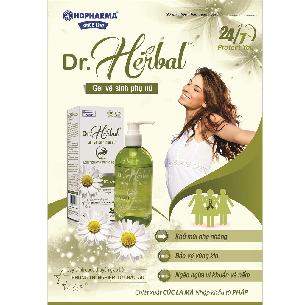 Gel vệ sinh phụ nữ Dr.Herbal - Hương thơm mát, chăm sóc dịu dàng được chị em tin chọn vì nhà sản xuất HDPHARMA cam kết thành phần không có Paraben (chất bảo quản hóa học); được chiết xuất từ Cúc La Mã nhập khẩu từ Pháp có tác dụng làm dịu các tổn thương da, giảm viêm, chống nhiễm khuẩn; quy trình sản xuất được chuyển giao từ phòng thí nghiệm châu Âu, theo chuẩn mực chất lượng cao nhất trên thế giới hiện nay là GMP EU.