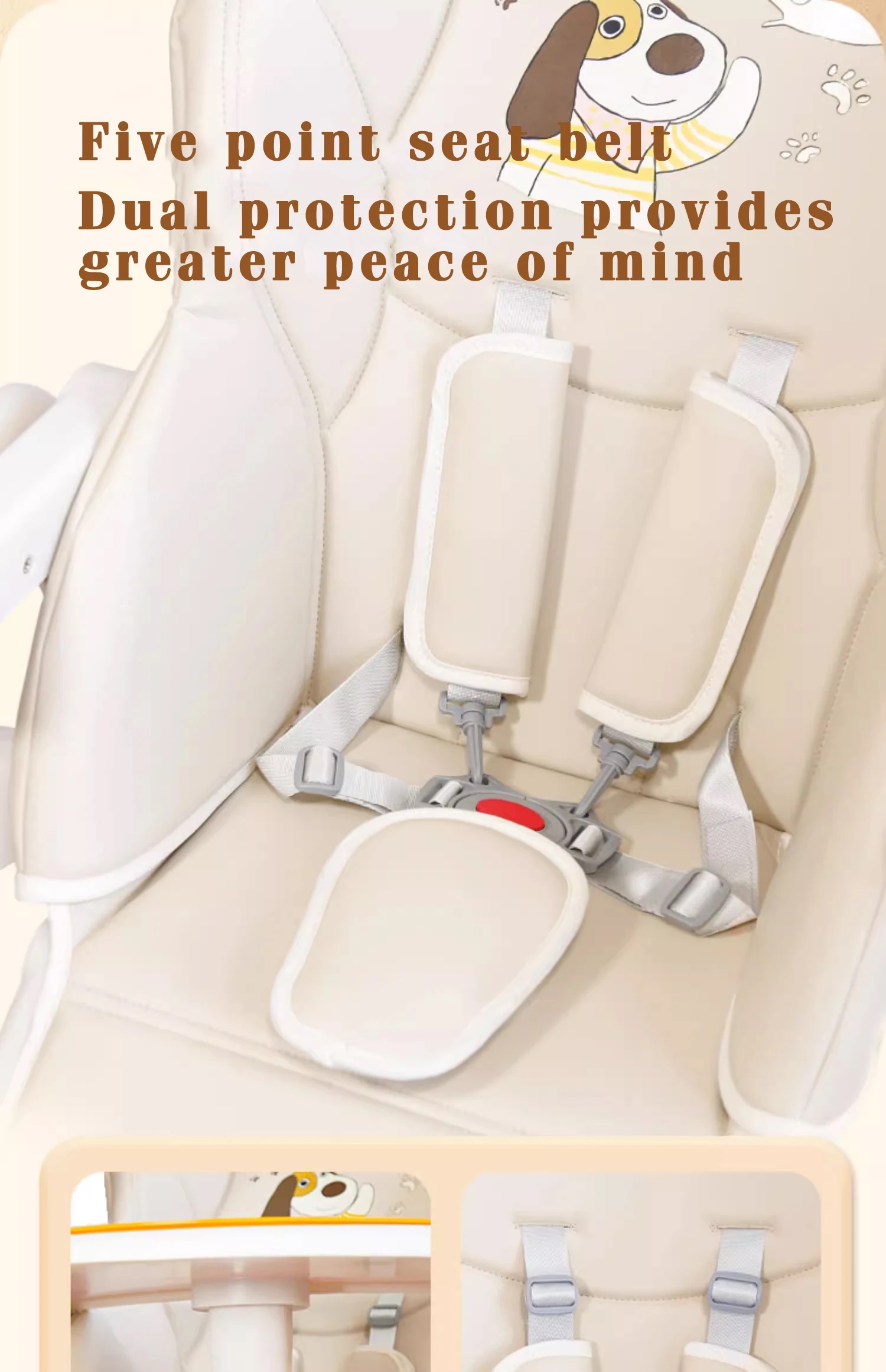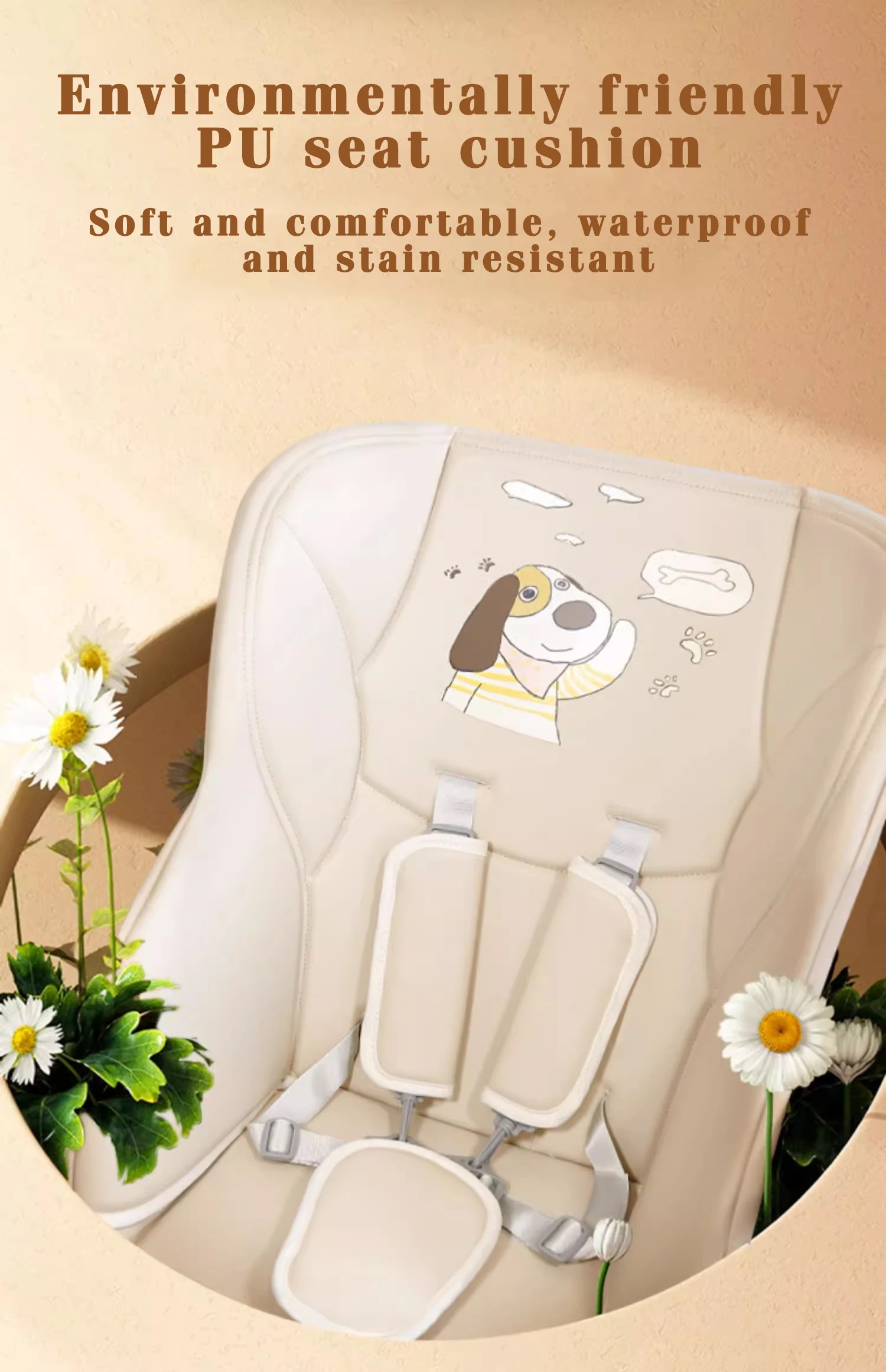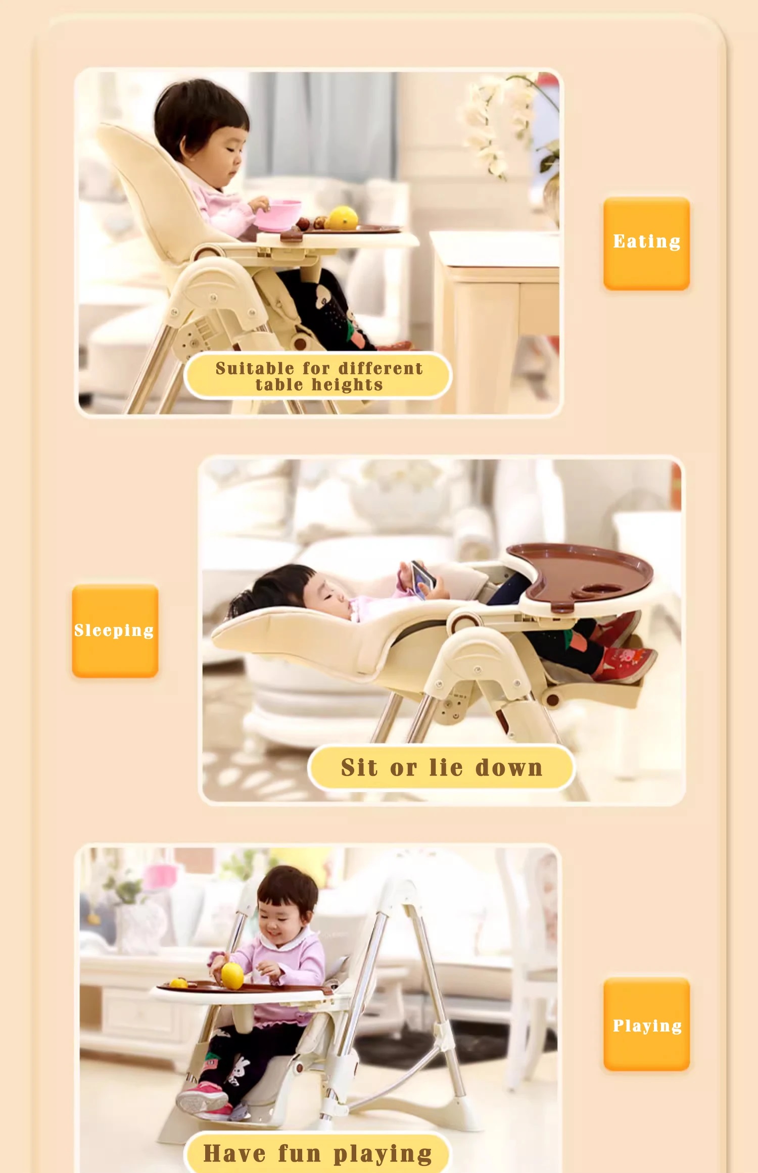 • Ghế ngồi có thể điều chỉnh được ở 3 vị trí • Ghế ngồi thoải mái, chất liệu giả da cao cấp • Khay ăn có thể điều chỉnh và tháo rời dễ