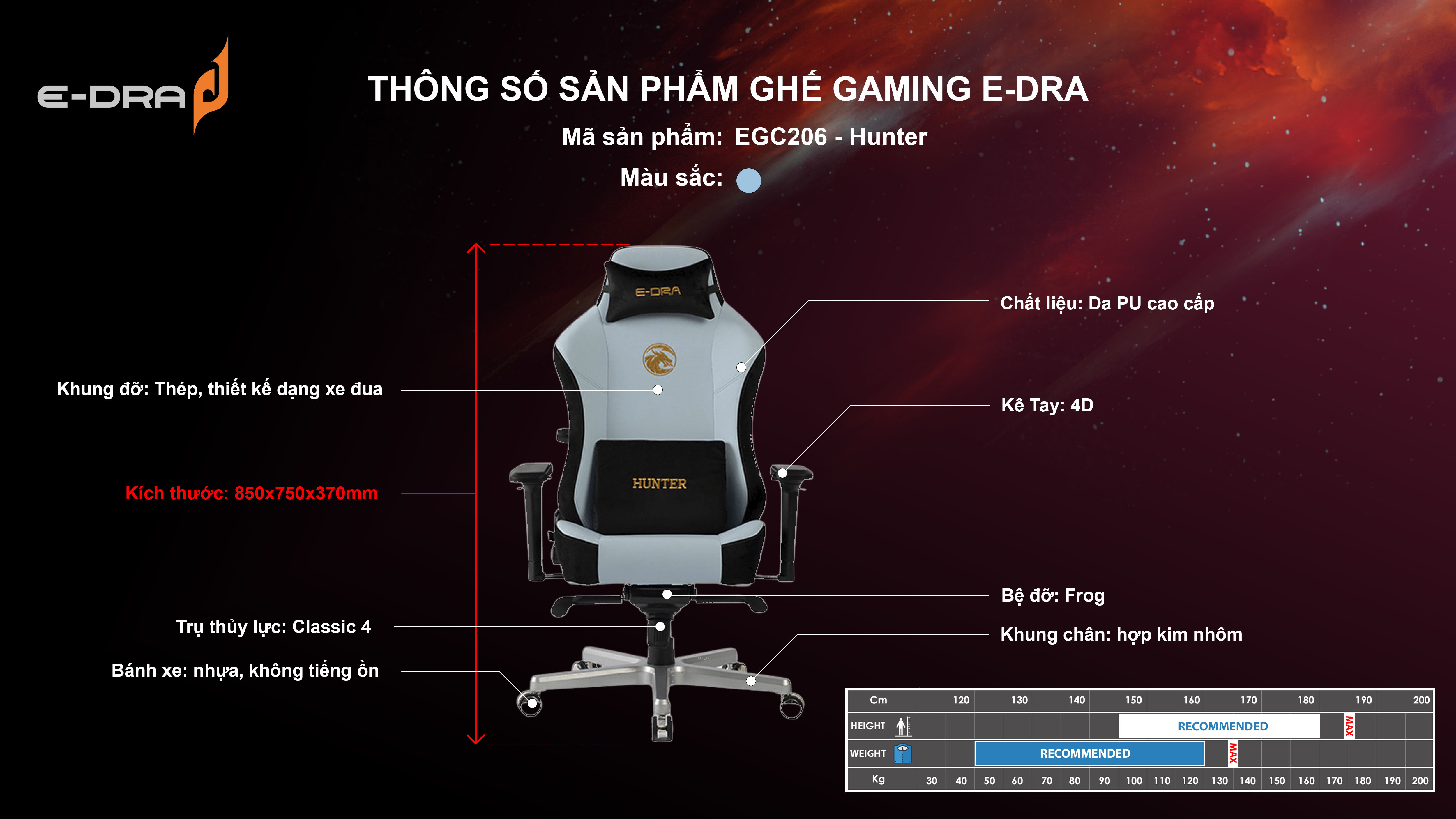 Sau sự thành công của những mẫu ghế chơi game giá rẻ và bàn gaming, E-Dra tiếp tục cho ra mắt một số mẫu ghế gaming giá rẻ cực kỳ chất lượng, mà tiêu biểu trong số đó là chiếc E-Dra Hunter EGC206 có thể nói là "bá đạo" trong phân khúc tầm trung. Dưới đa là phân tích chi tiết về mẫu ghế đang cực hot này E-Dra Hunter EGC206 được làm từ​ Da PU,nhựa PVC,Farbric và hợp kim nhôm Ghế chơi game E-Dra  E-Dra Hunter EGC206 có đệm siêu dày và hoàn toàn nguyên khối. Đệm của ghế có độ đàn hồi và chống lún cực tốt đem lại sự thư giãn và thoải mái cực độ khi sử dụng. Đệm nguyên khối siêu dày Tay ghế  E-Dra Hunter EGC206 thế hệ mới thiết kế 4D, bạn có thể điều chỉnh theo 4 chế độ khác nhau: Lên và xuống, Chiều dọc, Chiều ngang, Góc chéo 2 hướng trái và phải một cách dễ dàng để phù hợp với tư thế ngồi thoải mái nhất, chất liệu bằng nhựa mềm mại dễ chịu. Tay ghế E-Dra Hunter EGC206 Black thiết kế 4D E-Dra Hunter EGC206 có thiết kế công thái học nhằm mục đích phù hợp nhất với con người. Phần lưng ghế hơi uống cong vào trong đảm bảo toàn bộ lưng ghế sẽ vừa vặn với lưng người ngồi. Phần phía trên đầu có xu hướng cong ra tạo cho phần đầu luôn ở tư thế thẳng. Vị trí lắp gối đầu cũng rất linh hoạt: với người cao trên 1m75 có thể đặt phía trên logo, với người có chiều cao thấp hơn có thể lắp gối đầu ở vị trí bên dưới. E-Dra Hunter EGC206 Black có thiết kế công thái học Một thiết kế mới cực kì đặc biệt đó là E-Dra Hunter EGC206 điều chỉnh phần lưng dày mỏng theo tư thế ngồi, giúp hạn chế tối đa đau mỏi lưng, cột sống khi bạn ngồi nhiều giờ liên tục Núm vặn điều chỉnh lưng ghế E-Dra Hunter EGC206 Black Với trụ thủy lực class 4, E-Dra Hunter EGC206 có thể chịu được trọng tải cực lớn lên đến 150kg đảm bảo cho mọi đối tượng người dùng có thể sử dụng ghế mà không lo mất an toàn hay sợ hỏng ghế. Chính vì vậy bạn có thể hoàn toàn yên tâm sử dụng ghế lâu dài. Trụ thủy lực class 4 – trọng tải 150kg Bộ khung của E-Dra Hunter EGC206 được làm từ những vật liệu cao cấp, trải dài trên toàn bộ lưng và mông ghế. Đặc biệt dưới mông ghế được giá cố bằng các thanh thép có độ dày lớn. Đảm bảo độ bền và ổn định ngang hàng với các thương hiệu ghế gaming cao cấp khác. Phần bánh xe được gia công cực kì tỉ mỉ giảm thiểu tối đa tiếng ồn khi di chuyển