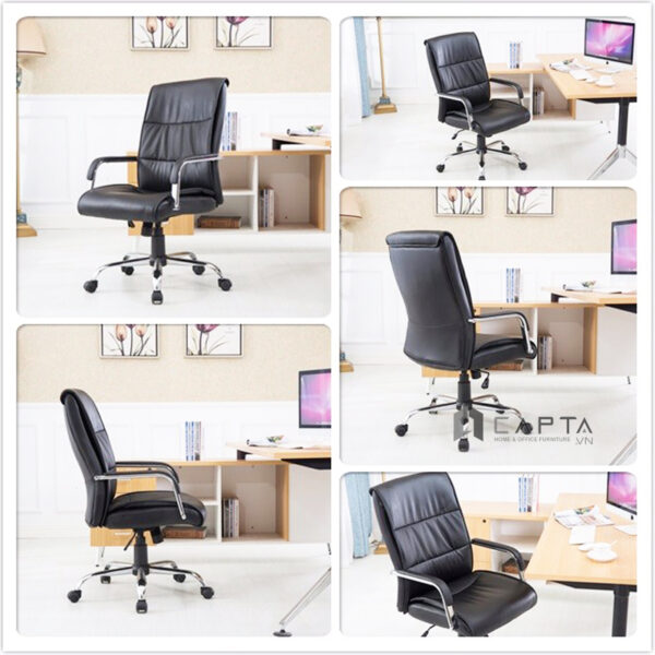 - Ghế xoay văn phòng cao cấp phù hợp ghế nhân viên, ghế trưởng nhóm, ghế làm việc tại nhà, ghế học bài học sinh trung học,… Ghế nhân viên lưng trung nệm simili cao cấp Ghế văn phòng cao cấp CE4422-P chất liệu nệm PVC dày mang lại cảm giác êm ái cực dễ chịu khi ngồi. Giúp xua tan các cơn đau nhức mỏi phần lưng mông đùi hiệu quả, không thấm nước, dễ dàng lau chùi khi bị bám bẩn. Tay thép mạ cao cấp, phần tiếp xúc được ốp PVC. Chân thép mạ chrome sáng bóng sang trọng. Ghế di chuyển tiện lợi nhờ bánh xe nhựa cứng chịu lực tốt. Pen ghế điều chỉnh nâng hạ độ cao từ 45 cm ~ 55cm phù hợp với mặt bàn và chiều cao người ngồi. Ghế xoay văn phòng cao cấp phù hợp ghế nhân viên, ghế trưởng nhóm, ghế làm việc tại nhà,…