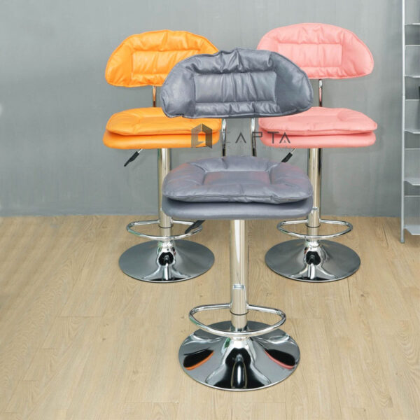 Ghế quầy bar có lưng tựa nệm vải bố Màu sắc: xám, vàng, nâu, xanh lá, xanh dương Chất liệu: nệm vải bố, chân thép mạ chrome Ghế quầy bar chân mâm tăng giảm chiều