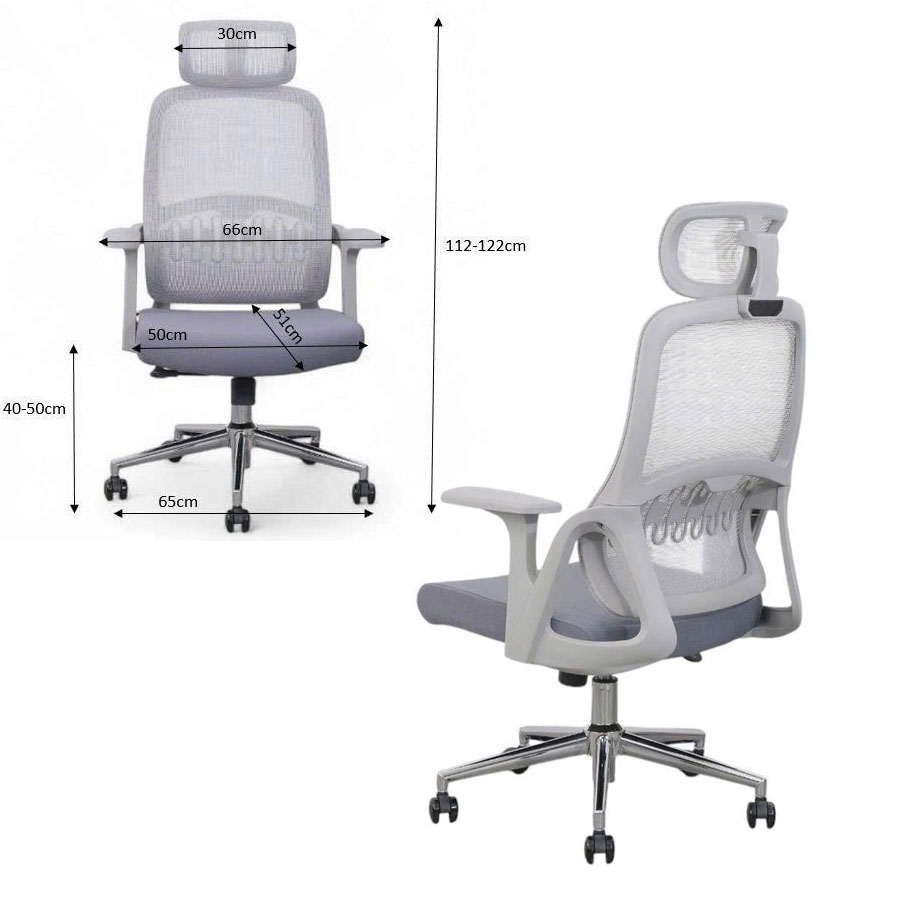Kích thước: W49-58 x D47 x H92-104 cm (Cao tổng). H từ ngồi đến lưng: 48 cm, H Tay: 64-76 cm, H đất-ngồi: 48-60 cm (Lúc Ben thấp – Ben cao) Chất liệu: lưng rời,