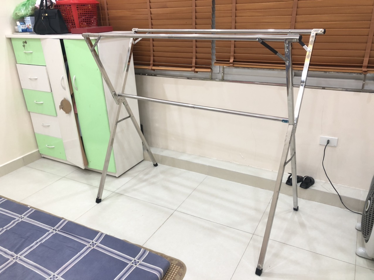 - Kích thước: Dài 120cm; khi bung ra rộng 85cm; đóng lại rộng 15.5cm - Các ống inox lớn, đường kính đến 22mm, dày 0.6mm, cam kết cho bạn treo đồ thỏai mái > 50kg