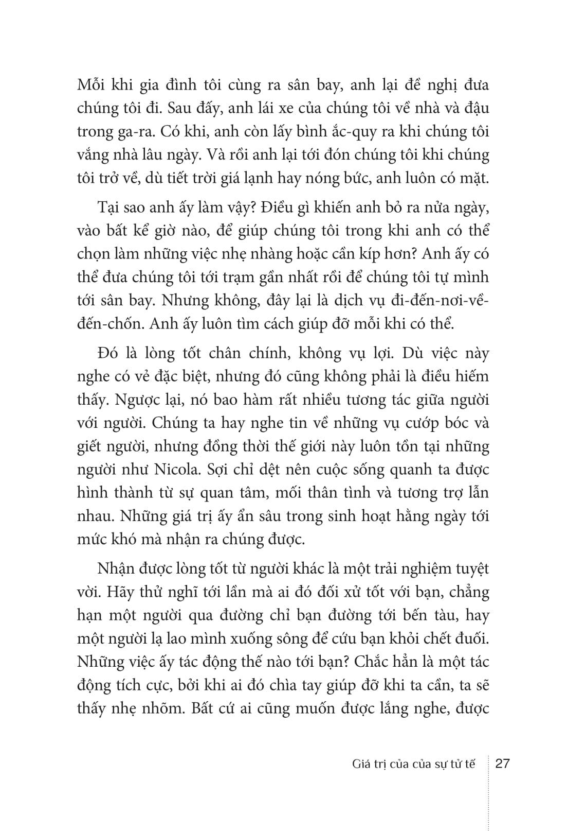 Giá Trị Của Sự Tử Tế Lòng tốt và sự đồng cảm là hai trong số nhiều điều thiết yếu khiến cuộc sống của chúng ta có ý nghĩa. Chúng là khởi nguồn cho hạnh phúc và niềm vui vĩnh cửu. Chúng là nền tảng của một trái tim nồng ấm, trái tim của người sẵn lòng dang tay giúp đỡ người khác một cách vô tư. Bằng lòng tốt, tình thương yêu, sự trung thực, chân thành và công bằng với tất cả mọi người, ta có thể bảo vệ sự tử tế. Đó là lẽ thường tình. Quan tâm tới mọi người là một việc đáng làm, bởi vì hạnh phúc của chúng ta gắn liền với hạnh phúc của những người khác. Nếu xã hội chìm trong đau khổ, bản thân chúng ta cũng đau khổ. Khi trái tim và tâm trí ta càng bị cái ác lấn át, ta càng trở nên bất hạnh. Bởi vậy, lòng tốt và sự đồng cảm là những giá trị ta không thể thiếu được. Việc cố gắng tạo ra điều gì đó tích cực trong cuộc sống là điều vô cùng quan trọng. Chúng ta không được sinh ra để gây rắc rối và làm hại người khác. Như Piero Ferrucci đã trình bày một cách đầy đủ và mạch lạc trong cuốn sách Giá trị của sự tử tế này, để cuộc sống thật sự có giá trị, ta cần củng cố và nuôi dưỡng những giá trị cơ bản của con người như sự nhiệt thành, lòng tốt và sự đồng cảm. Nếu làm được điều đó, cuộc sống của chúng ta sẽ trở nên có ý nghĩa, hạnh phúc và bình an hơn, đồng thời sẽ góp một phần tích cực vào thế giới quanh m.ình.