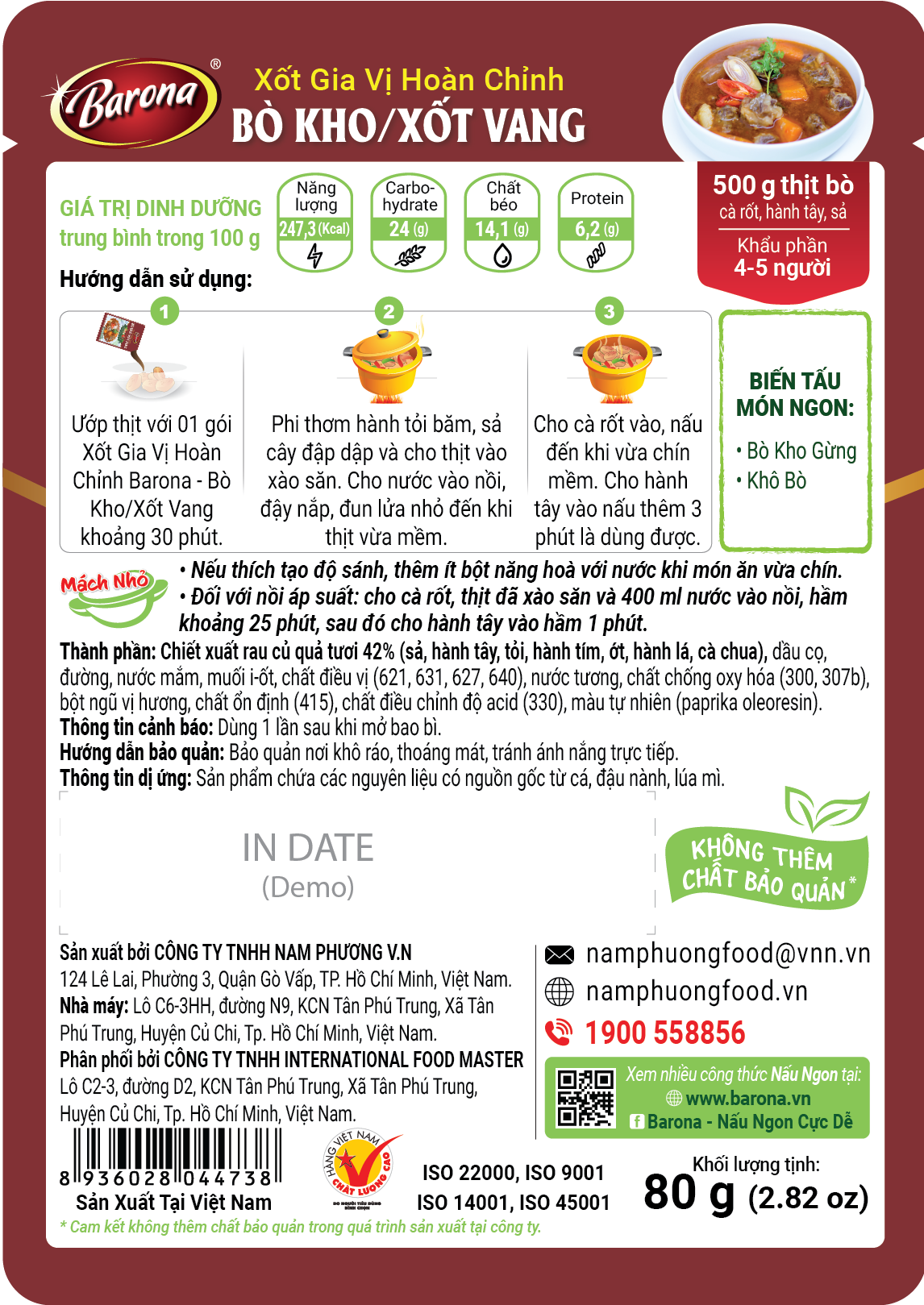 Gia Vị Bò Kho/ Xốt Vang Barona 80g ướp ngon chuẩn vị không cần nêm nếm Xốt Gia Vị Hoàn Chỉnh Barona là công thức phối trộn độc đáo giữa CHIẾT XUẤT RAU CỦ QUẢ TƯƠI như hành, tỏi, me, cà chua…cùng các loại gia vị truyền thống được chọn lọc, đem đến món ngon chuẩn vị chỉ trong tích tắc mà KHÔNG CẦN NÊM NẾM thêm bất kỳ gia vị nàokhác. Hạn sử dụng: 12 tháng Quy cách: 80g/ gói, 20 gói/ hộp , 4 hộp/ thùng *Hướng dẫn thực hiện: Bò kho/ Xốt Vang