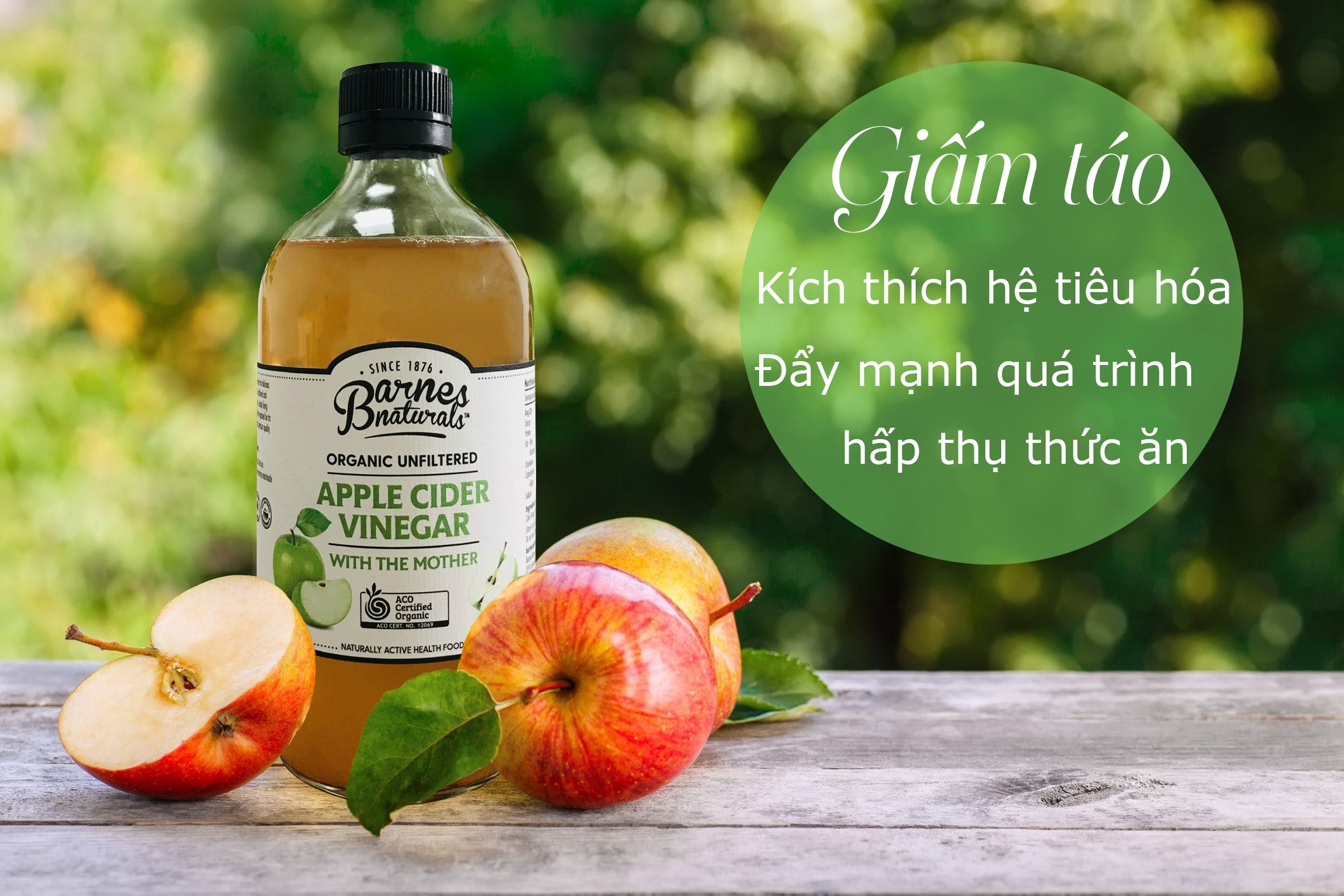 - Đặc điểm sản phẩm: Từ nước táo ép lạnh lên men tự nhiên Hữu cơ, không biến đổi gen Giấm thô, chưa qua lọc (nguyên giấm cái) Chứa enzym tự nhiên và lợi khuẩn Không màu, mùi nhân tạo Không chất bảo quản Không chứa gluten Thích hợp cho người ăn chay Chức năng: duy trì mức cân nặng hợp lý, hỗ trợ mức đường huyết khỏe mạnh và hỗ trợ mức cholesterol khỏe mạnh