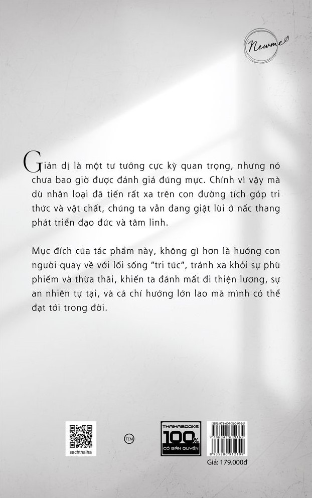 GIẢN DỊ Cuốn sách bạn đang cầm trên tay không phải là một cẩm nang về cách sống, hay hướng dẫn bạn thực hành một lối sống chuẩn mực. Thay vào đó, cuốn sách đi sâu hơn trong việc lý luận và xây dựng một hệ thống tư tưởng cho một cuộc sống đơn giản và hiệu quả. Trong nhiều năm sống giữa hai thái cực giàu và nghèo, giữa thiếu thốn và dư dả, giữa đạm bạc và xa hoa, tôi đã suy nghiệm rất nhiều về khao khát của con người khi tìm cách bứt ra khỏi đói nghèo và vươn tới được sự giàu có. Mấu chốt đằng sau rõ ràng là để đạt tới cái mà chúng ta gọi là “hạnh phúc”, một từ tương đối mơ hồ, khó nắm bắt, nhưng đầy hứa hẹn. Sau cùng, tôi đã tự tìm ra cho mình thứ viên mãn hơn hết thảy, đó là đời sống giản dị. Thứ đời sống mà nghe qua thì không có gì hấp dẫn, không có gì đặc biệt và thật dễ để đạt tới, ấy thế mà nó lại được ưa chuộng và khuyến khích bởi rất nhiều vĩ nhân từ cổ chí kim. Giờ đây, nó là tư tưởng đang trỗi dậy mạnh mẽ, sống dưới cái tên “chủ nghĩa tối giản”. Đặc biệt hơn, nó đã trở thành một phong trào được. phát triển bởi những người trẻ, những con người hiện đại, đầy sức sống và giàu trí tuệ.” (Lời tác giả) Trong cuốn sách này, tác giả Nguyễn Đỗ Thành Đạt đã đưa ra những suy nghiệm và tư tưởng về phương cách sống giản dị, một lối sống được nhiều người theo đuổi. Với mong muốn mang tới cho bạn đọc trước hết sự thay đổi trong tâm thức, để hiểu tại sao chúng ta cần sống một cuộc đời đơn giản hơn, nói cách khác, tại sao tư tưởng giản dị lại chính là chìa khóa giải quyết mọi vấn đề mà nhân loại đang phải đối mặt. Về bố cục, tác phẩm này sẽ được chia thành bốn phần: