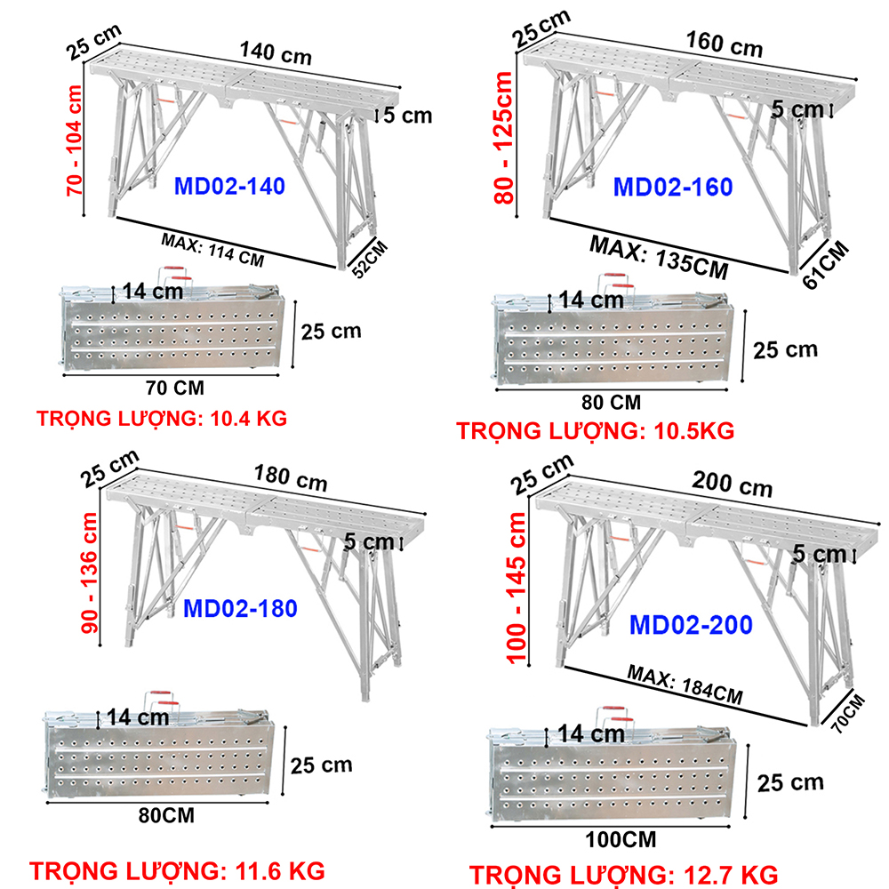 Giàn giáo di động, chắc khỏe, an toàn Có nhiều kích thước để lựa chọn dài: 1m2, 1m4, 1m6, 1m8, 2m Tải trọng: 150kg Chiều cao có thể thay đổi từ 60- 145cm (tùy kích