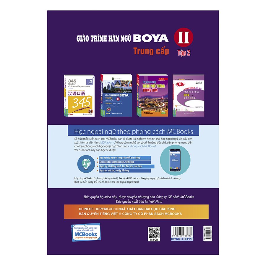 Giáo Trình Hán Ngữ Boya Trung Cấp 2 (Tập 2) là cuốn thứ hai trong hệ thống giáo trình trung cấp, dùng thích hợp cho đối tượng đã bước vào giai đoạn trung cấp và bứt phá hướng lên giai đoạn cao cấp. Thông qua việc biên soạn tác giả hy vọng cuốn giáo trình đạt được một số mục đích sau: Lựa chọn đề tài và tài liệu ngôn ngữ có lời văn tao nhã nhằm phản ánh sâu sắc hiện thực và truyền thống văn hóa Trung Quốc, cung cấp cho người học nguồn tài liệu chuẩn mực để người học tìm hiểu, suy ngẫm, mô phỏng, đánh giá. Để tăng vốn từ vựng cho người học, giáo trình đã tham khảo nhiều bộ sách đại cương tiêu chuẩn theo từng cấp học, bố trí khối lượng lớn các bài tập về từ vựng. Ngoài ra, nội dung các bài đọc thêm cũng được lựa chọn sao cho liên quan nhất định đến chủ đề của bài khóa nhằm ôn luyện lại những từ mới đã học. Người học sau khi học xong cuốn giáo trình này sẽ có vốn từ vựng phong phú đa dạng. Khi bước vào giai đoạn trung cấp, người học đã nắm chắc hệ thống ngữ pháp cơ bản của tiếng Hán nên trọng tâm giảng dạy của cuốn giáo trình này là ưu tiên chú trọng vào hư từ và các mẫu câu. Ngoài ra đặc biệt chú trọng rèn luyện phương pháp, kĩ năng biểu đạt trong văn viết. Tăng cường khối lượng bài tập ôn luyện từ mới, hướng dẫn người học sắp xếp từ ngữ thành câu sau đó sắp xếp câu thành đoạn văn, bài văn. Việc đọc kĩ các nội dung trong cuốn giáo trình còn giúp người học được tiếp xúc và tìm hiểu nền văn hóa Trung Hoa, từ đó hiểu được phương thức tư duy và phương thức biểu đạt ngôn ngữ độc đáo của người Trung Quốc. Đối với những người tự học tiếng Hán, cuốn giáo trình này cũng cung cấp cho người tự học nguồn kiến thức phong phú với những chú thích tường tận tỉ mỉ, số lượng câu, ví dụ, các bài luyện tập đa dạng giúp cho họ có thể tự tin hoàn thành việc học của mình ở giai đoạn trung cấp. KHÁC BIỆT  CỦA GIÁO TRÌNH Cuốn giáo trình này cũng giống như cuốn giáo trình Hán ngữ BOYA Trung cấp tập I, đó là sử dụng lí luận theo chủ đề đồng thời cũng chú trọng tới Từ ngữ Trọng Điểm (bao gồm từ vựng và ngữ pháp), đặc biệt là có sự kết hợp hữu cơ giữa chức năng của từ ngữ và yếu tố văn hóa. Nhìn chung, cuốn giáo trình này có những đặc điểm cụ thể sau: