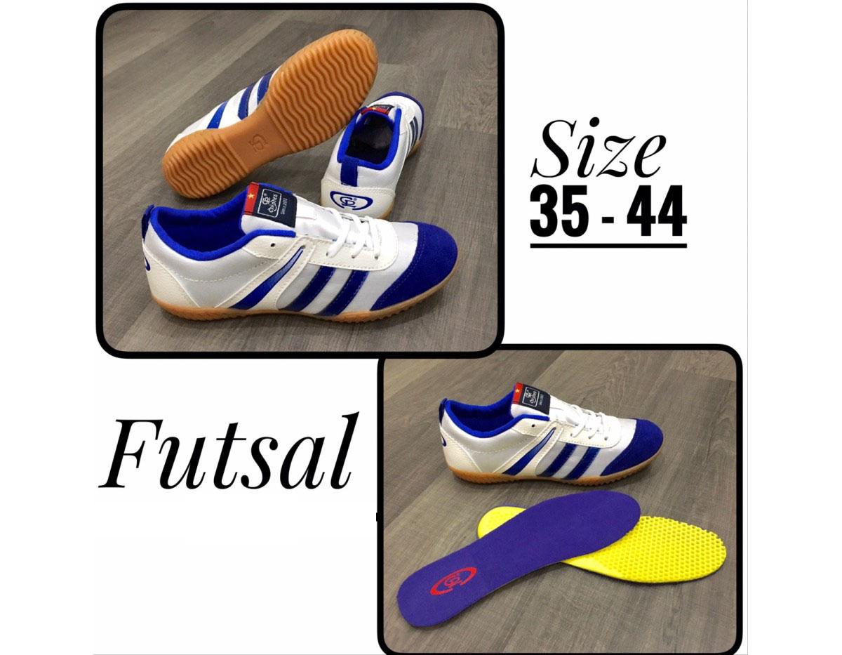 Giày đá bóng futsal mới màu xanh quân đôi cho độ bám sàn tốt cũng như có độ bền cùng độ dẻo dai cao, là chọn lựa lý tưởng của những bạn nam yêu thích