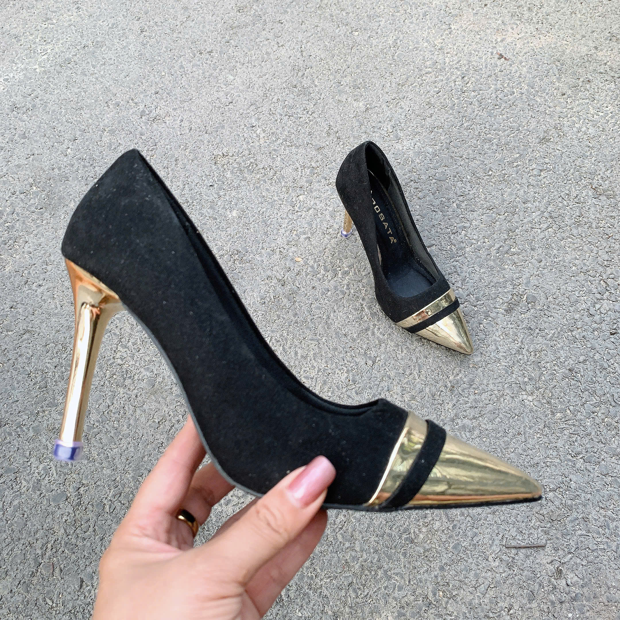 Giày cao gót thiết kế dáng mũi nhọn, chân nhọn phối đế vuông cao 6 cm. Giày có viền đính đá, làm bằng chất liệu da lộn, tone màu đẹp giúp các nàng dễ dàng