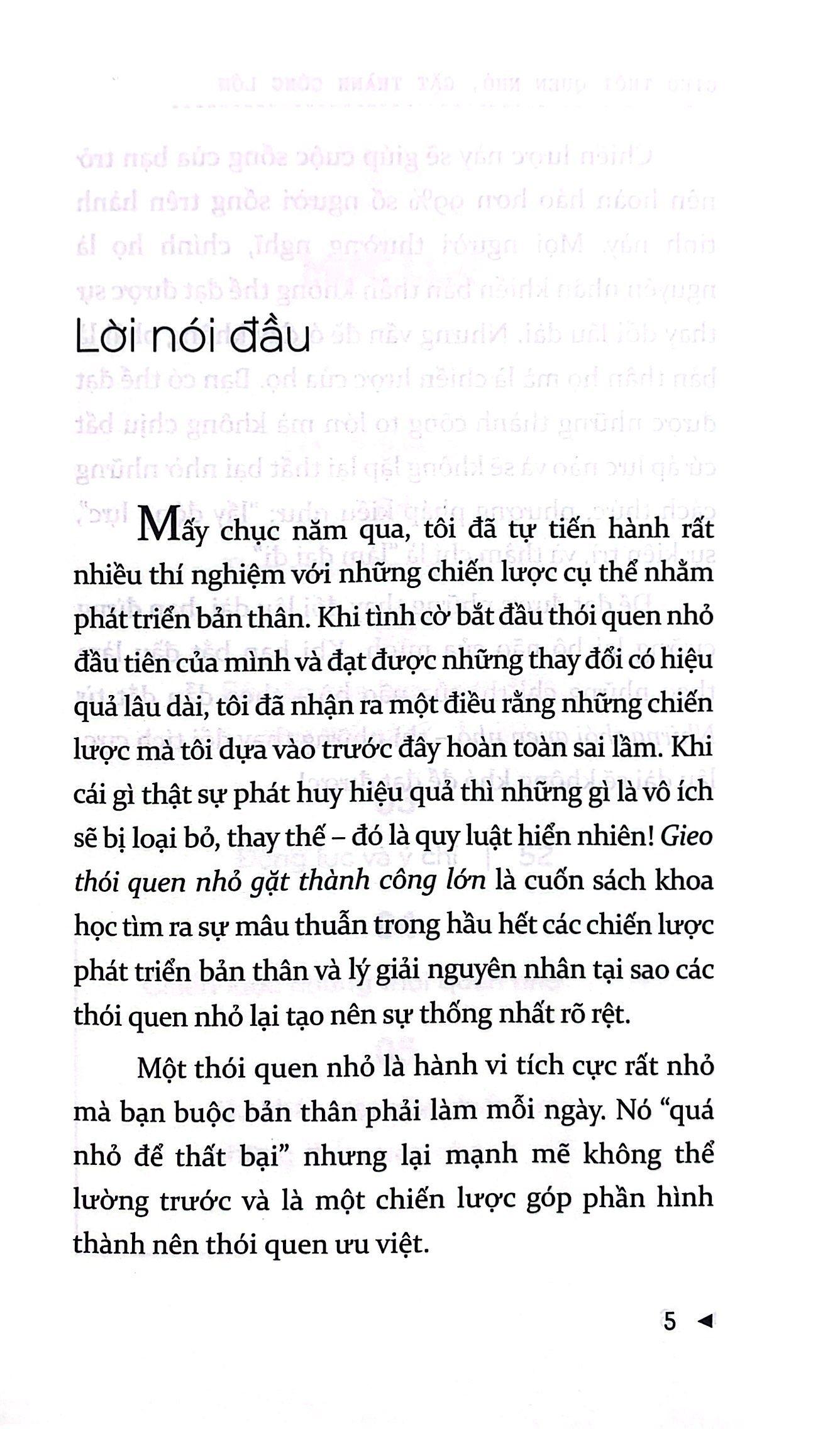 Gieo thói quen nhỏ, gặt thành công lớn là cuốn sách khoa học tìm ra sự mâu thuẫn trong hầu hết các chiến lược phát triển bản thân và lý giải nguyên nhân tại sao các thói quen nhỏ lại tạo nên sự thống nhất rõ rệt. Một thói quen nhỏ là hành vi tích cực rất nhỏ mà bạn bắt bản thân phải làm mỗi ngày. Nó “quá nhỏ để thất bại” nhưng lại mạnh mẽ không thể lường trước và là một chiến lược góp phần hình thành nên thói quen ưu việt.