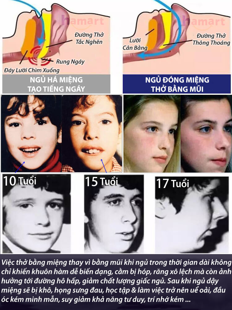 Thở bằng miệng khi ngủ là 1 tật xấu gây ảnh hưởng đến sức khỏe, hoạt động của phổi, giảm nồng độ oxy trong máu, viêm họng, bệnh lý về răng miệng Nó còn gây