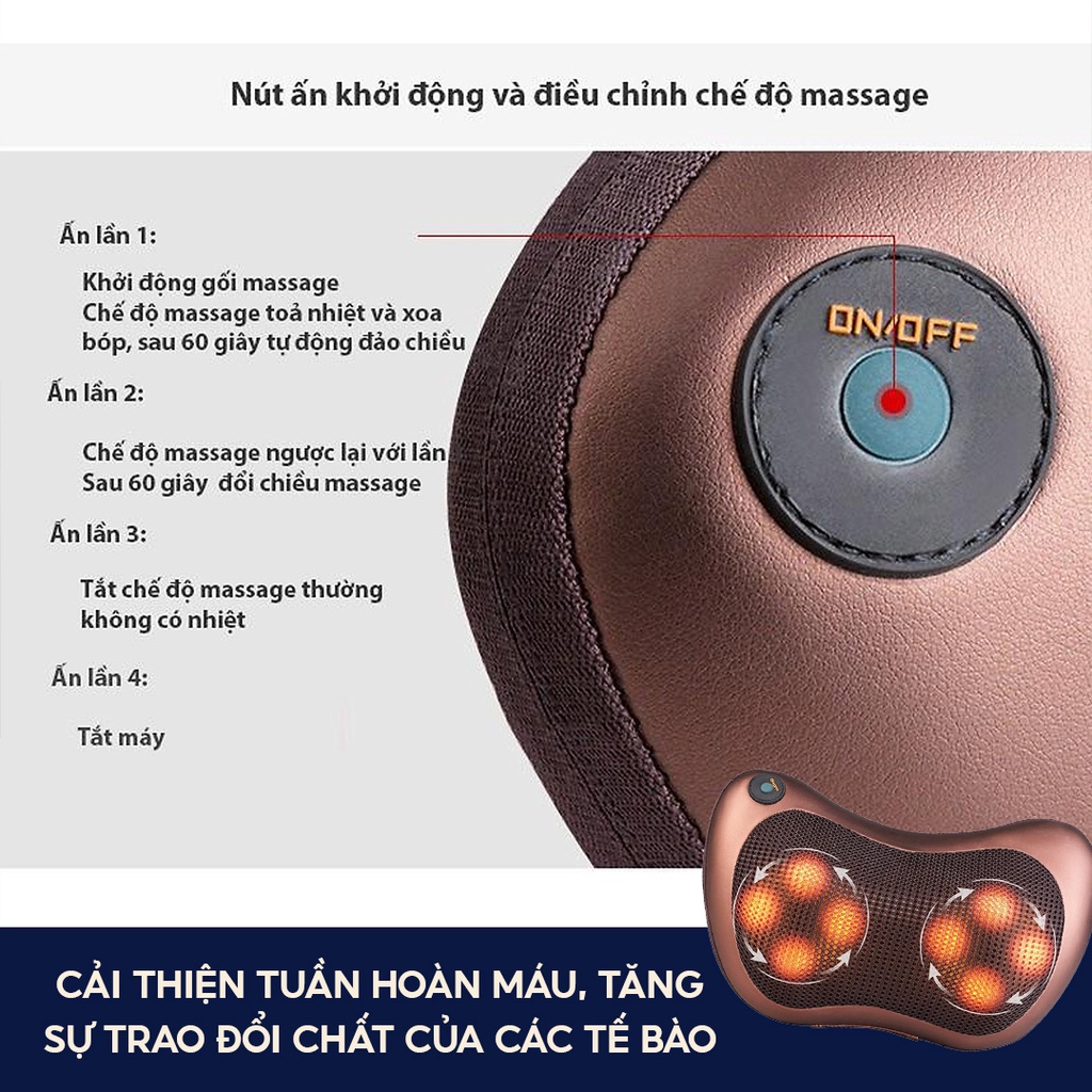 - Gối massage hồng ngoại Magic massage xung nhịp tuần hoàn, các đầu bi mát xa hồng ngoại tác dụng trực tiếp lên các vùng cơ massage,