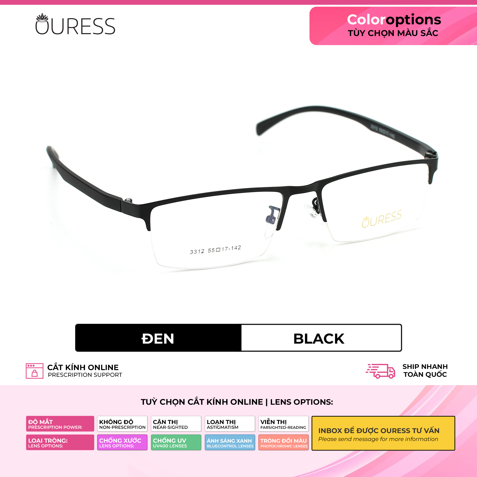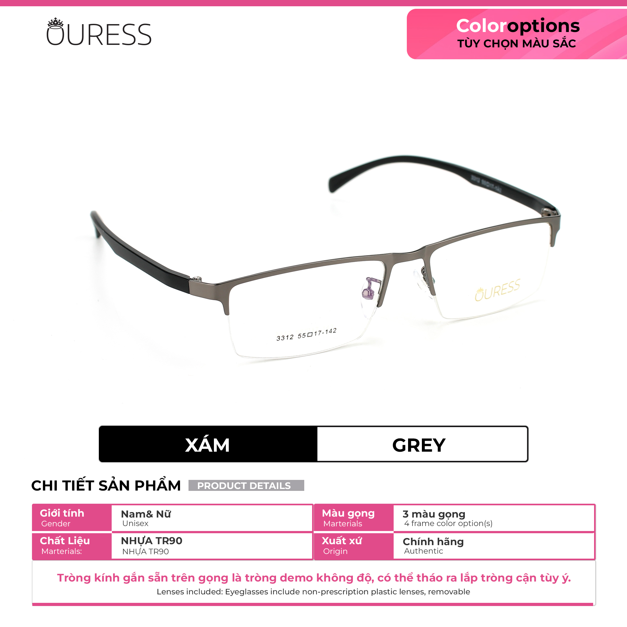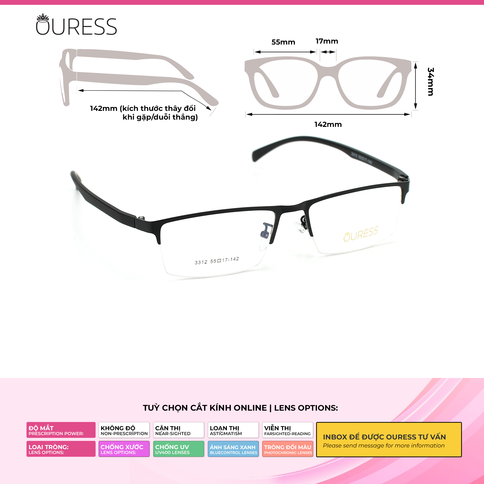 Gọng kính hợp kim rất được ưa chuộng và được các thương hiệu nổi tiếng lựa chọn cho những sản phẩm của họ. Khung gọng kính là loại gọng nửa khung hay còn gọi là xẻ cước, tạo nên nét đẹp thời trang và nhẹ nhàng thanh thoát trên gương mặt • Càng kính chắc chắn, chất liệu là nhựa dẻo TR90. giúp người mang không đau ở vành tai, thoải mái mang cả ngày, kể cả khi đội mũ bảo hiểm ôm sát đầu. • Chống xước tối ưu • Đệm mũi được bọc nhựa mềm, tạo cảm giác thoải mái khi đeo, hạn chế tuột xệ kính. • Thiết kế unisex, thời trang, đa dạng mẫu mã và màu sắc, phù hợp cho cả nam và nữ. • Đủ form trendy cho bạn chọn lựa --- Chiếc kính hoàn toàn gọn và nhẹ , tạo cảm giác thoải mái cho người đeo xuyên suốt ngày dài mà không bị khó chịu. ---- Gọng kính lắp được tất cả các loại tròng: CẬN / VIỄN/ LOẠN/ LÃO , với nhiều số độ khác nhau Với thiết kế độc đáo của Mã sản phẩm hợp kim cước này. Có 2 dạng thiết kế khác nhau về càng kính cho từng loại màu sắc. Tạo nên nét đẹp riêng cho gọng kính. Hãy liên hệ shop khi bạn muốn xem chi tiết sản phẩm nhé !! —-------------------------------------- THÔNG SỐ SẢN PHẨM : 3312 55-17-142: 3312 : mã sản phẩm 55: ngang khung tròng kính là 55mm 17: cầu mũi là 17mm 142 : chiều dài càng kính 142 mm Cao kính: 34 mm Chiều ngang tổng thể gọng kính: 142mm ++ Mã này là size kính dành cho gương mặt to vừa . tỷ lệ chênh lệch thông số +/- 2mm. Qúy khách có thể liện hệ shop để được tư vấn chọn gọng kính phù hợp với size gương mặt mình nhé vì đây chỉ là thông số tham khảo