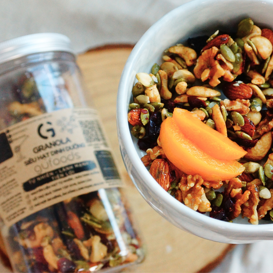 Granola thuần chay nướng mật dừa nước GUfoods là sản phẩm ngon lành phù hợp với những bạn thương đang eat clean hay theo chế độ ăn thuần chay. Thành phần của Granola nhà GU là các loại hạt dinh dưỡng, trái cây sấy được nướng cùng mật dừa nước thơm ngọt tự nhiên và hoàn toàn không chứa yến mạch. Granola thuần chay nhà GU là món luôn phải có để bạn thương nhâm nhi ăn vặt hoặc cho bữa sáng tiện lợi đó.