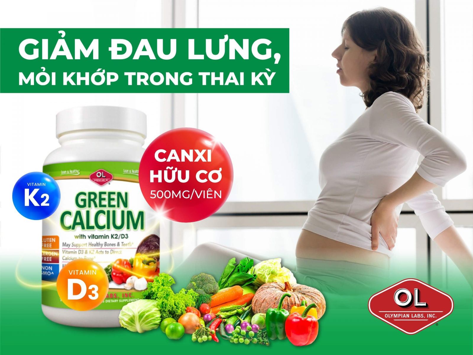 - Giảm đau lưng, mỏi khớp cho mẹ bầu trong suốt thai kỳ Nhiều bà bầu đau lưng, mỏi khớp trong thai kỳ được chẩn đoán do thiếu hụt canxi. Viên uống Green Calcium chứa hàm lượng canxi cao, chỉ với 2 viên mỗi ngày bà bầu đã cung cấp cho cơ thể lên đến 1000mg canxi cần thiết. Bên cạnh đó, với tổ hợp dinh dưỡng vitamin D3 + K2 có tác dụng hỗ trợ hấp thụ canxi, gắn kết canxi vào xương, tốt cho cả mẹ và bào thai. Từ đó, tình trạng đau lưng mỏi khớp thuyên giảm đáng kể.