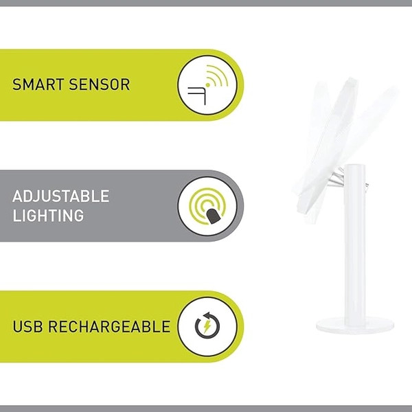 Công nghệ phát hiện cảm biến chính xác 3 chế độ tông màu sáng Tự nhiên/Sáng/Ấm Độ phóng đại 5X để nhìn rõ những gì bạn đang làm Gương di động từ tính 10x có thể tháo rời đi kèm với túi đựng Xoay 180 độ và góc 50 độ để dễ dàng điều chỉnh và lưu trữ. Mô phỏng ánh sáng mặt trời tự nhiên để phản chiếu hình ảnh của bạn tốt nhất. Chuyển đổi giữa chế độ cảm biến và chế độ thủ công Kích thước 23,3L x 13W cm