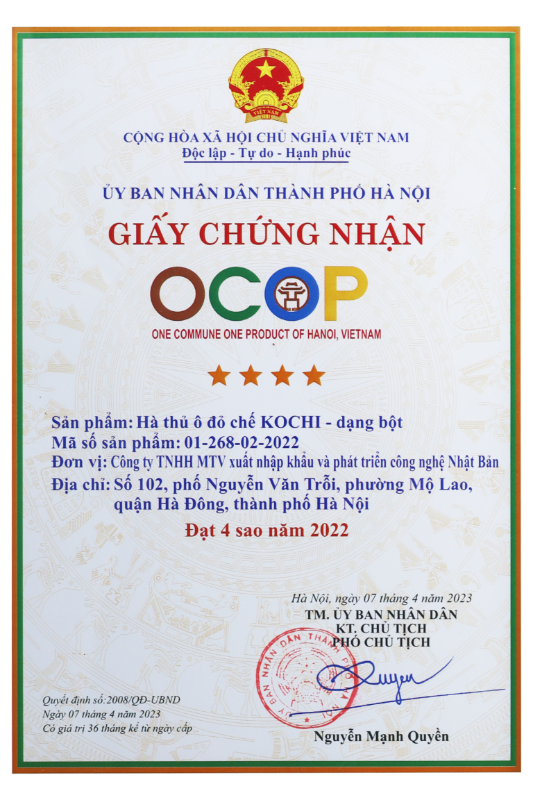 Hà thủ ô đỏ chế Kochi đã đạt được nhiều chứng nhận uy tín như: TOP Hàng Việt Nam được người tiêu dùng yêu thích bình chọn; Hàng Việt Nam chất lượng cao; OCOP 4 sao. Rất hiếm có sản phẩm hà thủ ô nào ở Việt Nam đạt được đồng thời những danh hiệu này như của Hà thủ ô đỏ chế Kochi. Những chứng nhận, danh hiệu này thể hiện uy tín, chất lượng của Hà thủ ô đỏ chế KOCHI, cũng như sự tin yêu của Quý khách hàng.