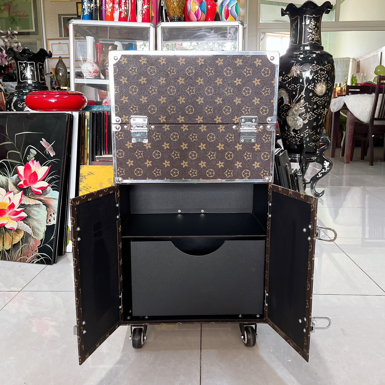 - Tầng trên gồm 4 mâm kéo sang 2 bên, khay chia nhiều ô vuông (có thể tháo rời tùy ý) tiện lợi giúp bạn đựng nhiều dụng cụ phun xăm, nối mi, và nhiều dụng cụ khác. Cốp nhiều ngăn, đáy sâu, thoải mái đựng đủ bộ đồ nghề phun xăm, nail, mi tiêu chuẩn.