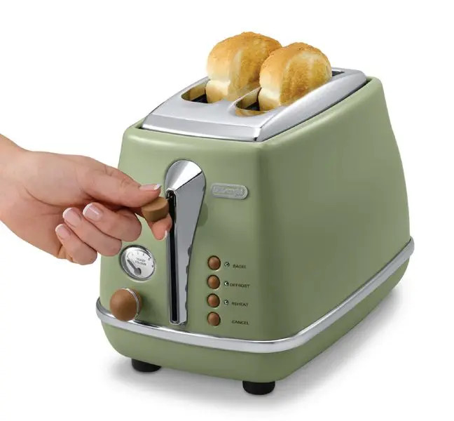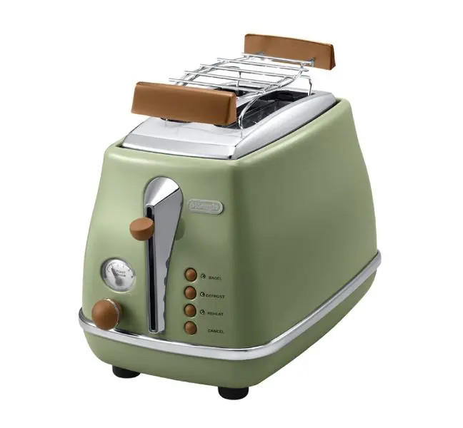 Mô Tả Sản Phẩm Máy nướng bánh mì Delonghi CTOV2103.GR thiết kế cổ điển với màu xanh rêu thu hút ánh nhìn, không chỉ nướng bánh mì mà còn rã đông, hâm nóng bánh, dễ
