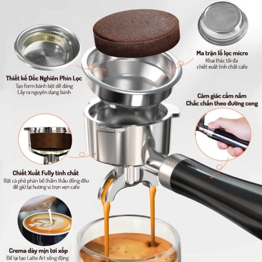 - Tay cầm inox và họng pha 51mm