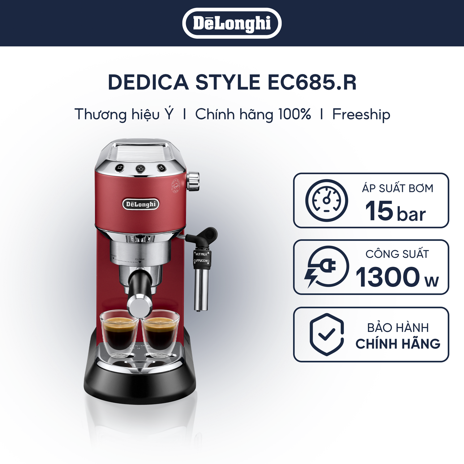 Công suất 1350W Bơm áp lực: 15 bar Dung tích: 1,1L Có thể pha Espresso và Cappuccino Bình chứa nước có thể tháo rời dễ dàng, van an toàn hoạt động linh hoạt giúp bạn