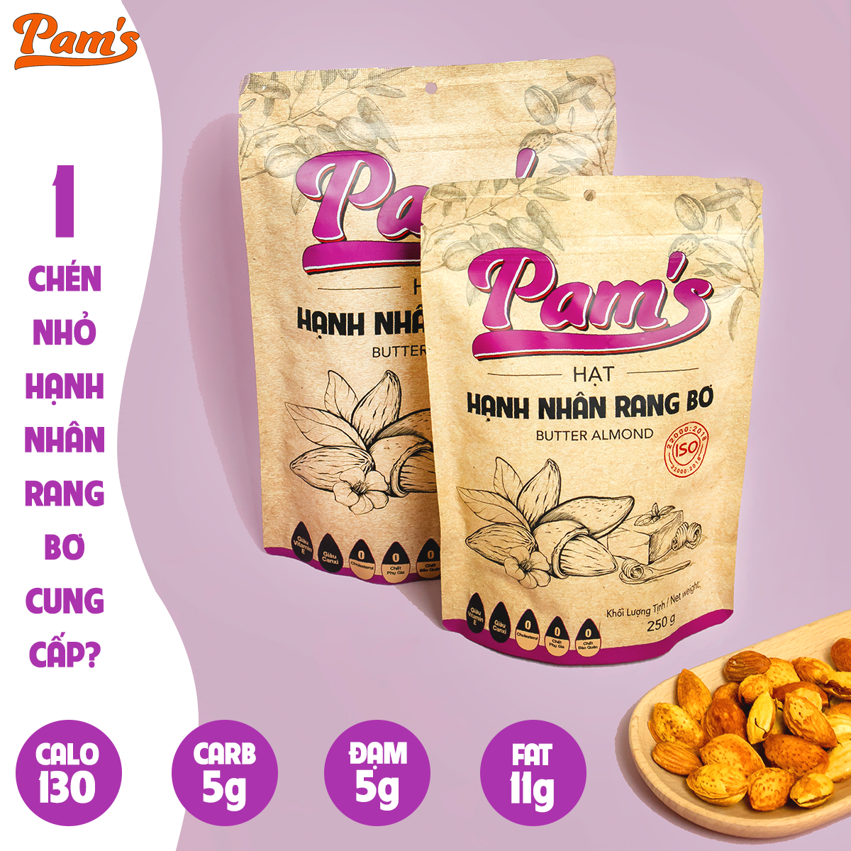 - 100g Hạnh nhân rang bơ Pams cung cấp: 640calo, 52g chất béo chưa bão hoà, 22g Carbs, 21g Protein, 3.75mg Sắt, 250mg Canxi...