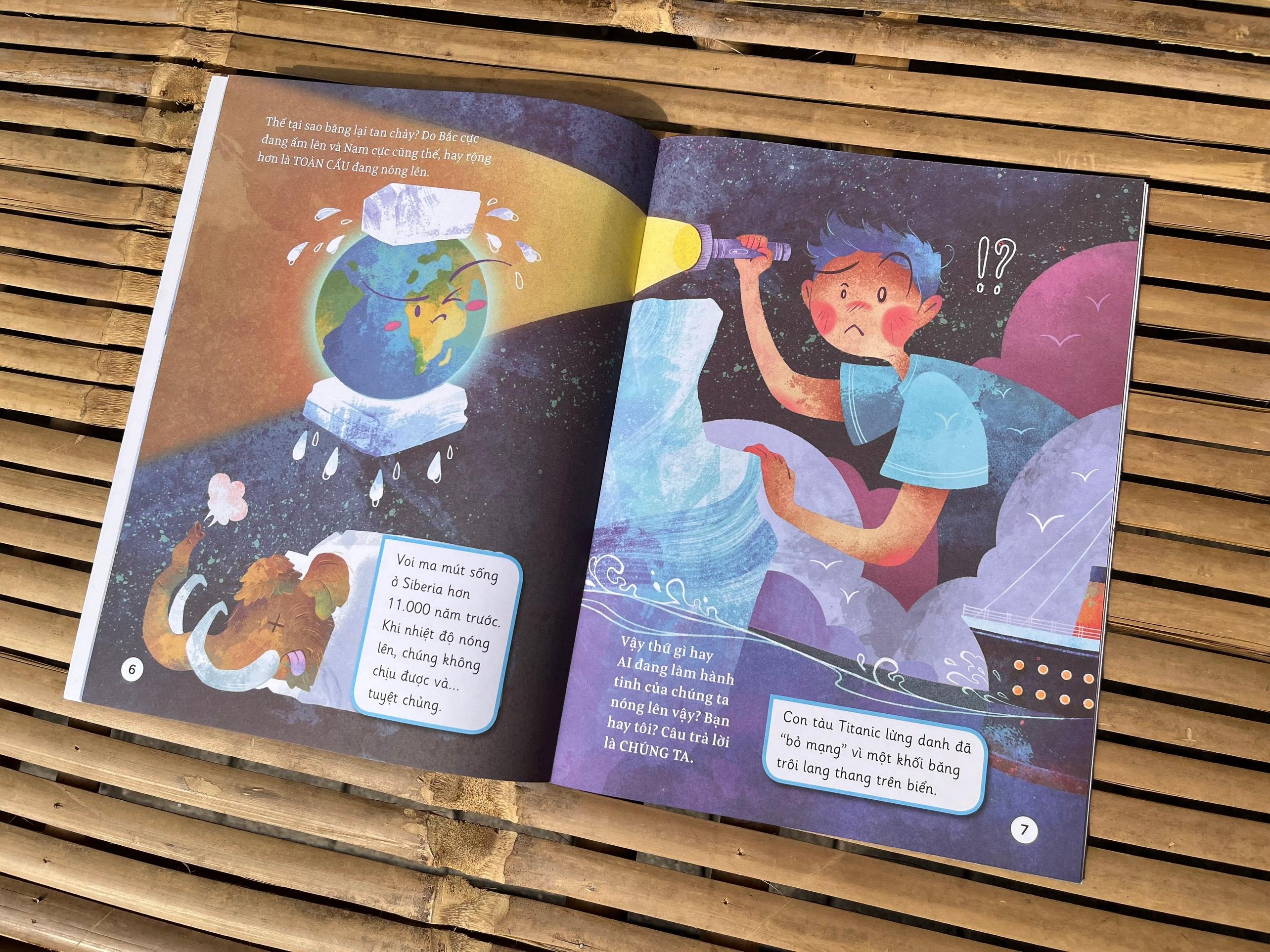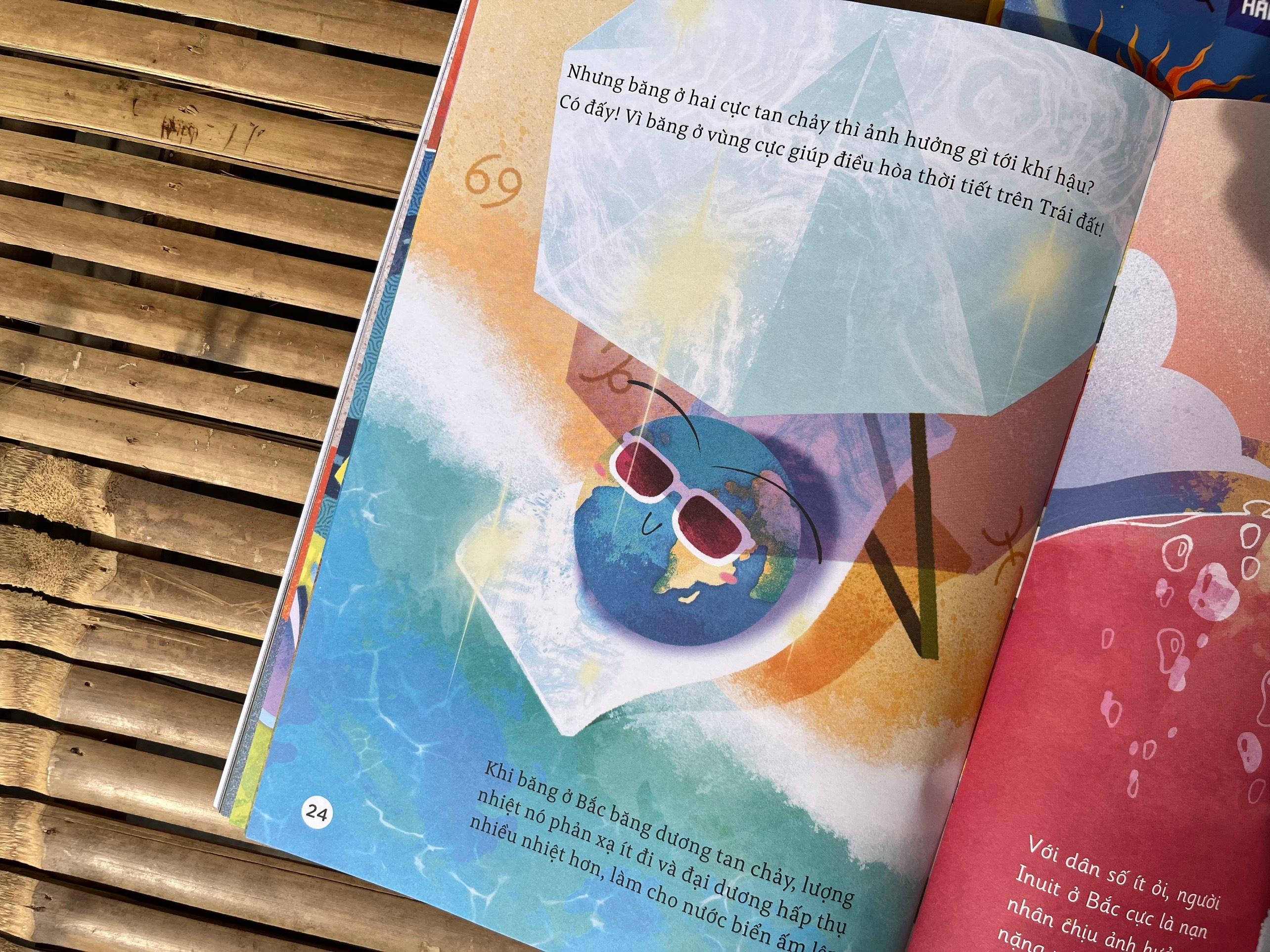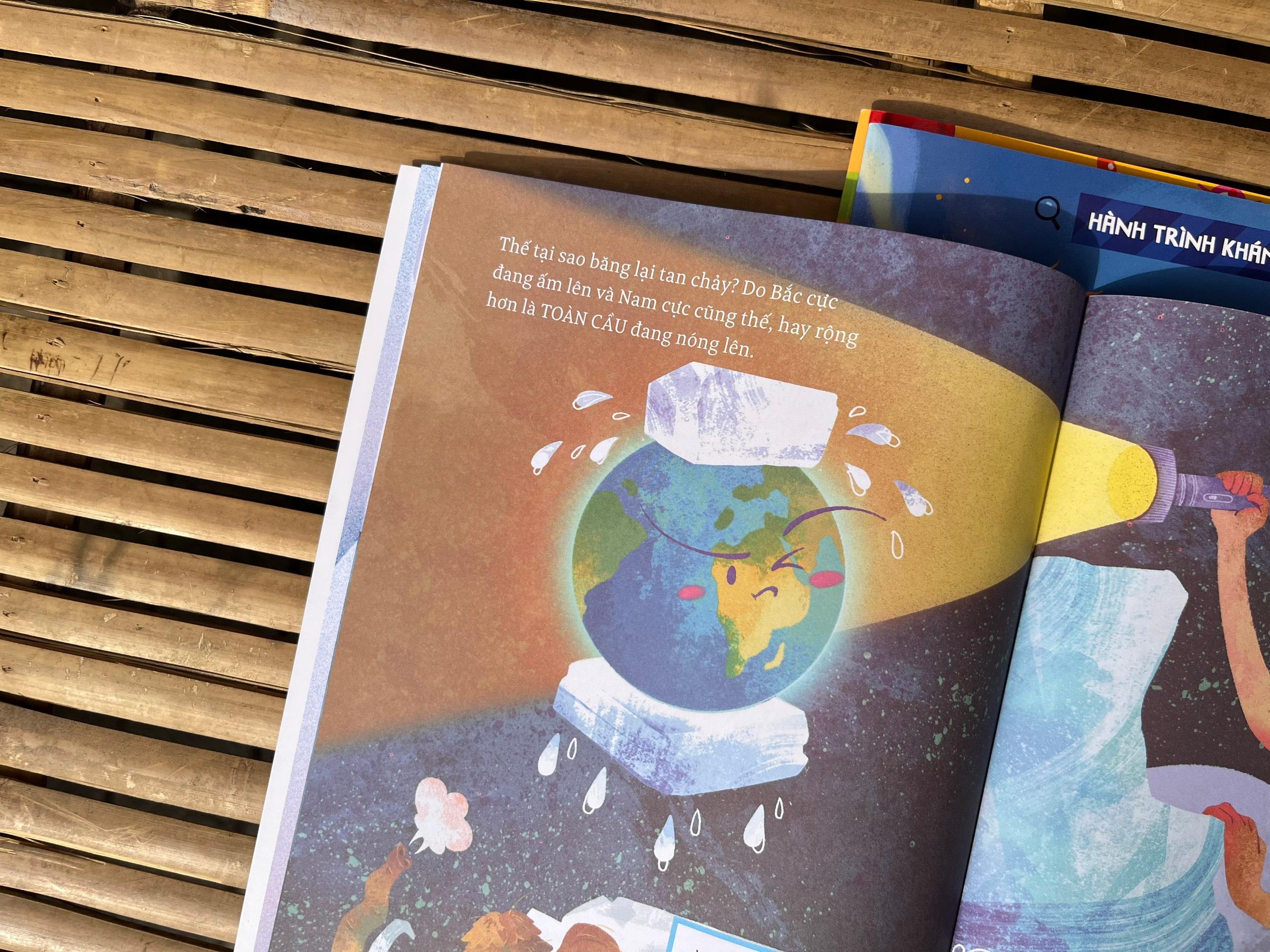 GẤU BẮC CỰC CẦN BĂNG: Tại Bắc cực, những chú gấu đang ngày càng buồn bã vì ngôi nhà m.ình sống đang ngày càng bé lại và không còn mát mẻ như xưa. Thông qua câu chuyện về gấu Bắc cực, ta mới thấy biến đổi khí hậu đang tàn phá Trái đất như thế nào! Khí hậu ấm lên làm băng ở hai cực đang tan chảy ngày một nhanh hơn. Mà vì sao lại như thế? Ngoài một phần nhỏ do tác động tự nhiên, thì chính con người - có tôi và bạn trong đó nữa - là nguyên nhân chủ yếu! Cuốn sách sẽ cho ta thấy con người đang tự gây hại cho m.ình, cho các loài động thực vật khác, cho tự nhiên và cho chính Trái đất này như thế nào. Khi đã hiểu, thì bạn cũng sẽ biết làm thế nào để ngăn chặn chuyện đó. Hãy cùng khám phá qua cuốn sách “Gấu Bắc cực cần băng” nha.