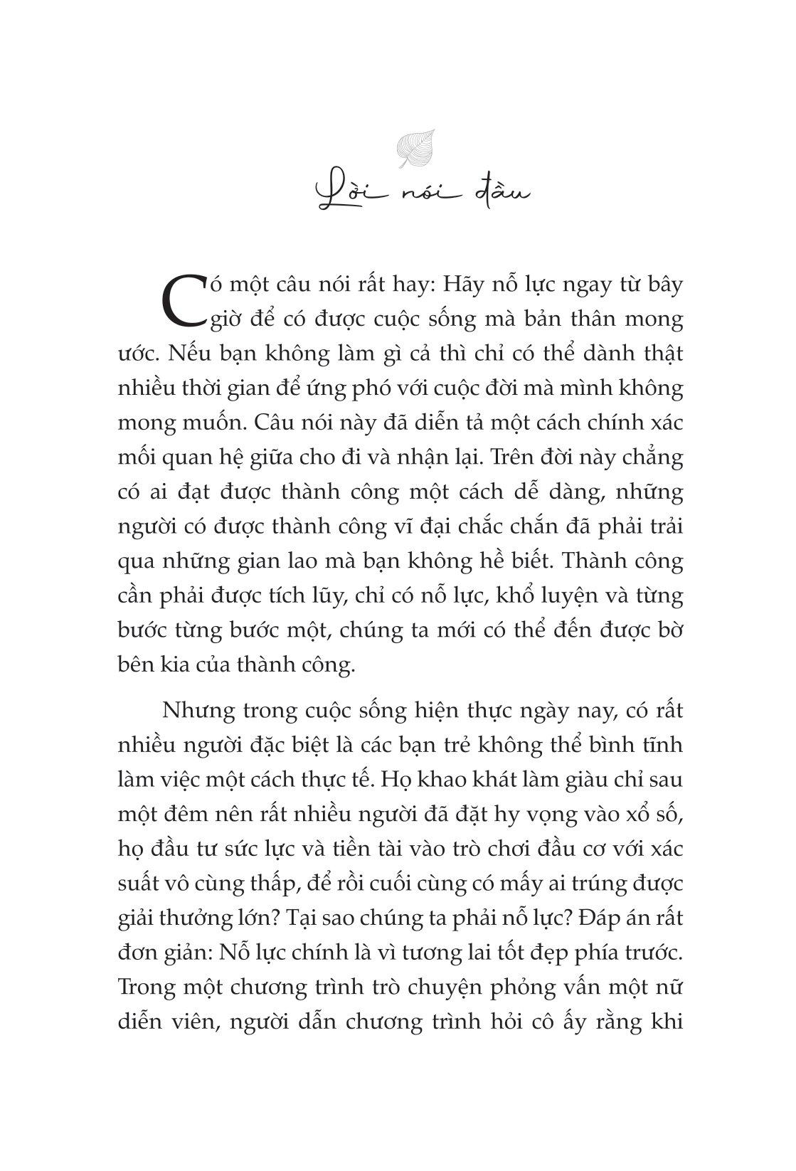 - Gian khổ bạn trải qua sẽ mở đường cho tương lai của bạn Vì sao hành trình vạn dặm bắt đầu từ một bước chân là một cuốn sách không thể bỏ lỡ? Bạn có cần động lực không? CÓ! “Người luôn chùn bước vĩnh viễn không thể trở nên ưu tú hơn, chỉ có trải qua muôn vàn thử thách và chà đạp, ở thời điểm ta đứng lên lần nữa mới có thể càng thêm rực rỡ lấp lánh. Chỉ có người dũng cảm tiến về phía trước mới có thể leo lên đỉnh cao của thế giới để ngắm cuộc sống này.” Đời người có lúc thăng lúc trầm, có lúc vui vẻ, có lúc khổ đau. Nhưng đối mặt với áp lực và khổ đau, con người dễ dàng từ bỏ. “Hành trình vạn dặm bắt đầu từ một bước chân” sẽ là cuốn sách có thể thấu hiểu những nỗi vất vả mà bạn đang trải qua, để bạn hiểu được rằng, khi muốn buông xuôi hãy nhớ, lá trà phải dùng nước nóng mới trở nên thơm ngát, con người phải có gian khó ban đầu mới tiến được đến thành công. Bạn có cần tỉnh ngộ không? CÓ “Mọi sự tầm thường đều là hình ảnh thu nhỏ của việc không đủ nỗ lực. Kẻ thù lớn nhất của chúng ta không phải già nua và đau khổ, mà là một trái tim bằng lòng với thực trạng, được ngày nào hay ngày ấy” Ngày ngày nằm ườn bấm điện thoại, mơ ước về cuộc đời của người khác, có mong muốn nhưng chỉ sợ lúc làm sẽ thất bại nên không dám thử. Nhưng bạn cứ tiếp tục như thế thì tương lai sẽ cười vào mặt bạn. Nếu bạn chưa tỉnh ngộ, vậy cuốn sách sẽ giúp bạn làm điều đó. Những bài học đắt giá và đanh thép sẽ khiến bạn phải đứng dậy ngay lập tức. Bạn có cần giải pháp không? CÓ “Chỉ bằng cách hành động, chúng ta mới có thể xây dựng tòa nhà tham vọng trong trái tim m.ình, không có hành động, hết thảy đều là trăng trong nước, hoa trong gương.” Có hành động mới có thành công. Không chỉ mang đến động lực và khiến bạn tỉnh ngộ, tác giả mang đến những giải pháp thiết thực để bạn làm được những gì m.ình muốn. Chỉ bằng cách hành động, chúng ta mới chạm được đến ước mơ. Những bài học đắt giá trong cuốn sách Hành trình vạn dặm bắt đầu từ một bước chân Ý nghĩa của gian khổ: Người luôn chùn bước vĩnh viễn không thể trở nên ưu tú hơn, chỉ có trải qua muôn vàn thử thách và chà đạp, ở thời điểm ta đứng lên lần nữa mới có thể càng thêm rực rỡ. Chỉ có người dũng cảm tiến về phía trước mới có thể leo lên đỉnh cao của thế giới để ngắm cuộc sống này. Có lúc lên lúc xuống trong đời là chuyện bình thường: Vạn sự có được thì phải có mất, có mất ắt có được, mọi thứ chỉ là tương đối, trân quý sinh mạng, sống cuộc đời đầy giá trị và đẹp đẽ. Ý nghĩa của cuộc sống: Chúng ta không thể sống một cuộc đời mục nát. Ăn để sống, nhưng sống không chỉ để ăn. Trong cuộc đời con người, ý nghĩa cuộc sống rốt cuộc nằm ở đâu? Con người sống vì cái gì? Cuộc sống có thể không có quá nhiều ý nghĩa, nhưng nếu đã sống, chúng ta phải thiết lập một hướng đi trong cuộc sống cho chính m.ình. Nếu không cuộc sống dù tươi đẹp đến đâu cũng như nhai sáp, nhạt nhẽo và không hề có giá trị. Mơ ước là ngọn đèn soi đường chỉ lối: Lý tưởng là ngọn hải đăng của hành trình nhân sinh, là mục tiêu phấn đấu của cuộc đời, chỉ dẫn phương hướng tiến về phía trước của cuộc đời chúng ta, chỉ cần chúng ta kiên định đi theo phương hướng này, tôi tin rằng, chúng ta cuối cùng nhất định sẽ tới bờ bên kia thành công. Lý tưởng thuộc về mỗi chúng ta. Vì vậy, chúng ta hãy lập cho m.ình những mục tiêu, lý tưởng sống cao cả ở tuổi trẻ để cuộc sống thêm ý nghĩa và giá trị. Những trích dẫn hay trong sách giúp bạn vững bước để thay đổi