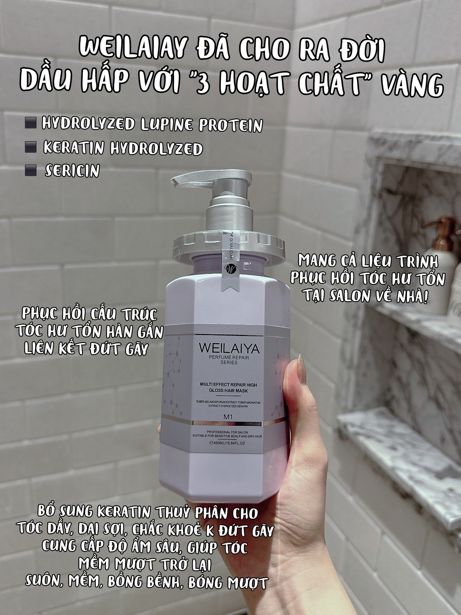 - Mùi hương sang chảnh như nước hoa hàng hiệu, lưu hương 3-4 ngày. Thành phần của Dầu hấp phục hồi liên kết tóc Weilaiya: