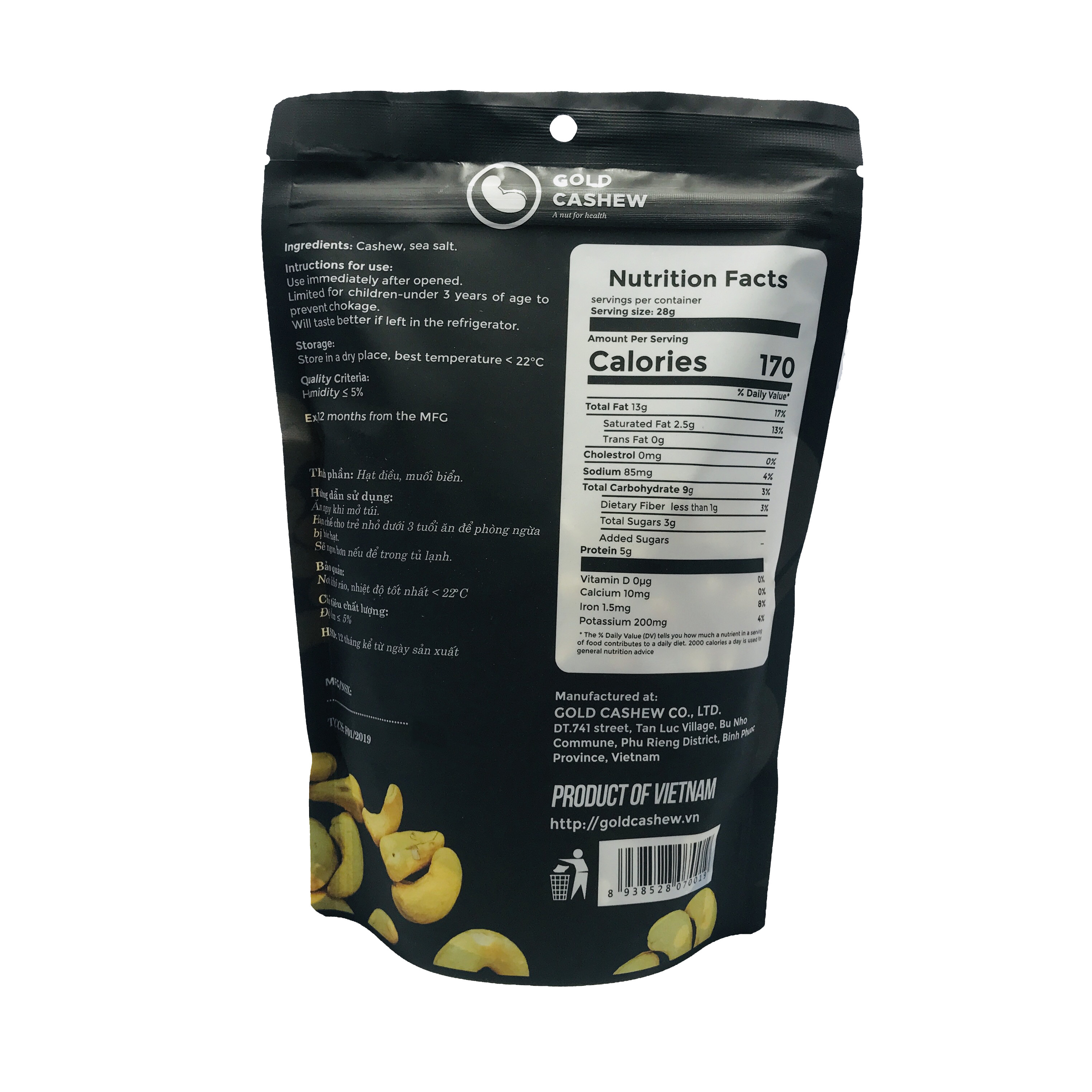 - Đặc điểm nổi bật của sản phẩm Công nghệ RANG KHÔNG DẦU tiên tiến, giữ trọn hương vị tự nhiên và chất dinh dưỡng có trong hạt điều và không gây ngán. Phương pháp RANG TINH THỂ MUỐI hạn chế tối đa lượng muối dư thừa, tốt cho sức khoẻ và người ăn kiêng. Là nguồn bổ sung SẮT, MAGIE và KALI tuyệt vời cho cơ thể Không chứa CHOLESTEROL – Cholesterol Free Không sử dụng THỰC PHẨM BIẾN ĐỔI GEN (Non-GMOs) Không CHẤT BẢO QUẢN – No Preservatives Duy nhất và chỉ có hạt điều size WW320 được chọn lọc, chế biến theo tiêu chuẩn Quốc tế của Hiệp Hội Bán Lẻ Anh Quốc – BRC Food, US FDA và chứng nhận VSATTP Việt Nam Được chọn lọc kỹ càng từ những hạt điều đã tách vỏ lụa, theo tiêu chuẩn WW320 kết hợp cùng muối biển tinh thể, Hạt Điều Rang Muối Cao Cấp GOLD CASHEW chắc chắn sẽ làm hài lòng các fan ruột của hạt điều với vị giòn và béo ngậy tự nhiên của hạt điều kết hợp với sự đậm đà từ muối biển.