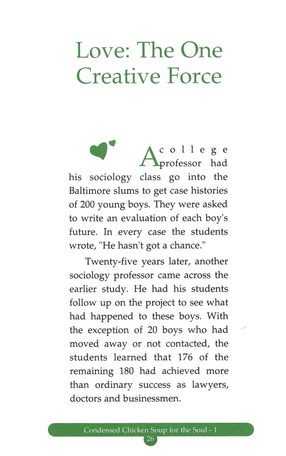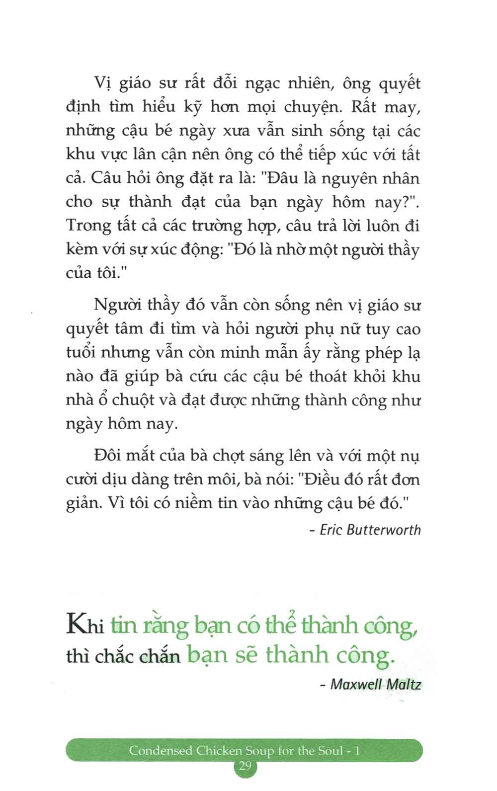 Chicken Soup for the Soul đã trở thành một thương hiệu lớn có giá trị không chỉ về mặt thương mại mà còn ở tính nhân văn cao đẹp. Những câu chuyện về tình yêu thương, về sự quan tâm của cha mẹ, về sự trải nghiệm khám phá và học hỏi trong bộ sách này sẽ khơi dậy khát vọng trong bạn, thôi thúc bạn dang rộng cánh tay chia sẻ đầy yêu thương với bạn bè và người thân, sẽ là niềm an ủi, xoa dịu những khi bạn căng thẳng tinh thần, sẽ làm bạn bừng sáng với những thời khắc của sự vượt lên chính mình và thức tỉnh cảm nhận. Chúng sẽ khuyến khích bạn kiên trì nuôi dưỡng, dám sống với ước mơ, sẵn sàng vượt qua những khó khăn, thử thách mà bạn chắc chắn sẽ gặp phải trên cuộc hành trình biến ước mơ thành hiện thực. Mỗi câu chuyện là một thông điệp có thể hàn gắn vết thương, làm thay đổi suy nghĩ, tâm hồn và đôi lúc, cả cuộc đời bạn.”