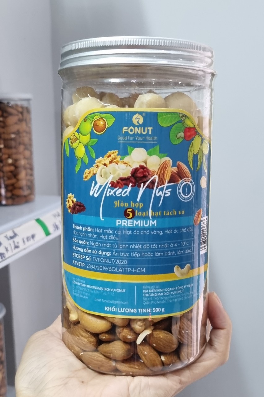 Hạt mix 5 loại hạt dinh dưỡng: ️ Thành phần: Hạt Macca của Úc, Hạt Điều của Việt Nam, Óc Chó đỏ Mỹ, óc chó vàng Mỹ và Hạnh Nhân của Mỹ ️ Cách đóng gói: hũ nhựa, đóng nắp nhôm ️ Trọng lượng: Hũ 500gr ️ Giá: 320.000 đ / hũ 500gr ️ HSD: 1 năm (ngày sản xuất và hạn sử dụng có in trên nắp hũ)