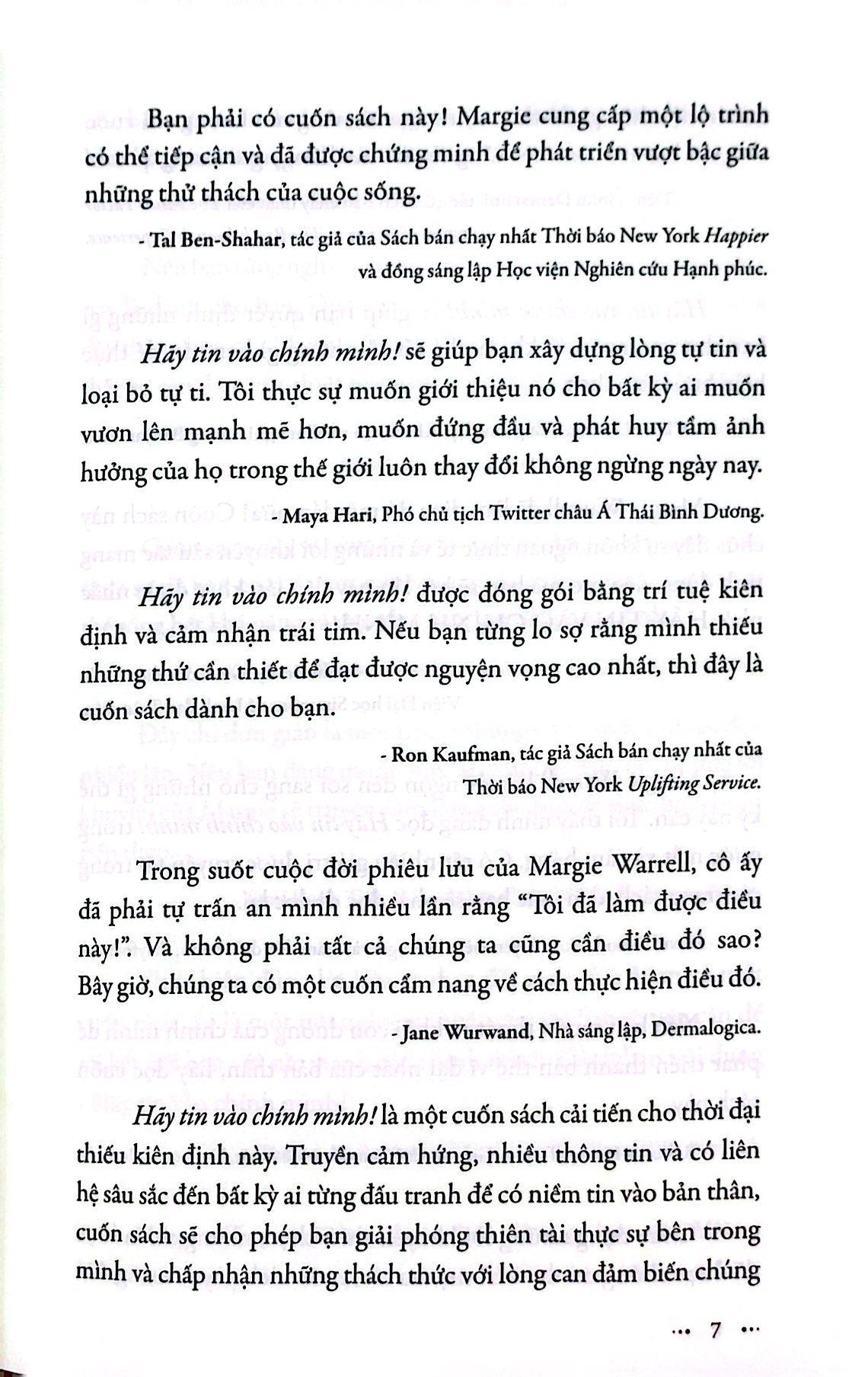 Những dòng chữ được viết bằng cả trái tim, cộng thêm những nghiên cứu khoa học vững chắc, Hãy tin vào chính mình! sẽ giúp bạn kết nối lại với sức mạnh bên trong, thúc đẩy khả năng tự phục hồi và tiếp thêm năng lượng cho lòng can đảm để bạn bay lên những tầm cao mới trong công việc, tình yêu và cuộc sống.