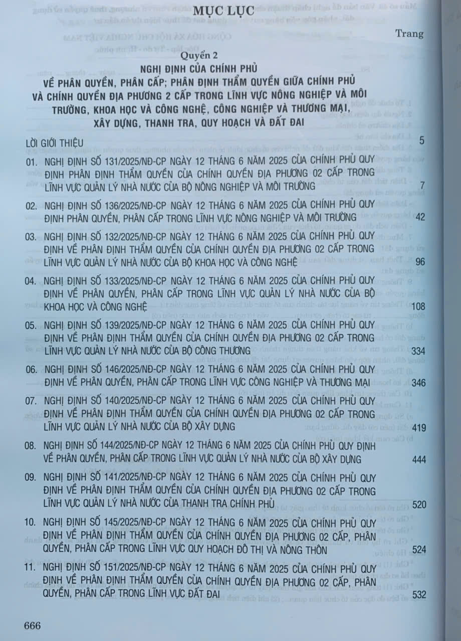 Quyển 2: Hệ thống các nghị định của Chính phủ về phân quyền, phân cấp; phân định thẩm quyền Chính phủ và chính quyền địa phương 2 cấp trong lĩnh vực nông nghiệp và môi trường, khoa học và công nghệ, công nghiệp và thương mại, xây dựng, thanh tra, quy hoạch và đất đai (có hiệu lực thi hành từ 01/7/2025)