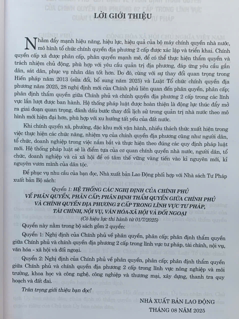 Bộ sách Hệ thống các nghị định của Chính phủ về phân quyền, phân cấp, phân định thẩm quyền giữa Chính phủ và chính quyền địa phương 2 cấp được xuất bản nhằm đáp ứng yêu cầu đổi mới quản trị quốc gia trong bối cảnh Hiến pháp 2013 (sửa đổi, bổ sung 2025) và Luật Tổ chức chính quyền địa phương 2025 có hiệu lực. Đây là bước đi quan trọng nhằm xây dựng mô hình chính quyền hiện đại, hiệu lực, hiệu quả, gần dân và phục vụ nhân dân tốt hơn.
