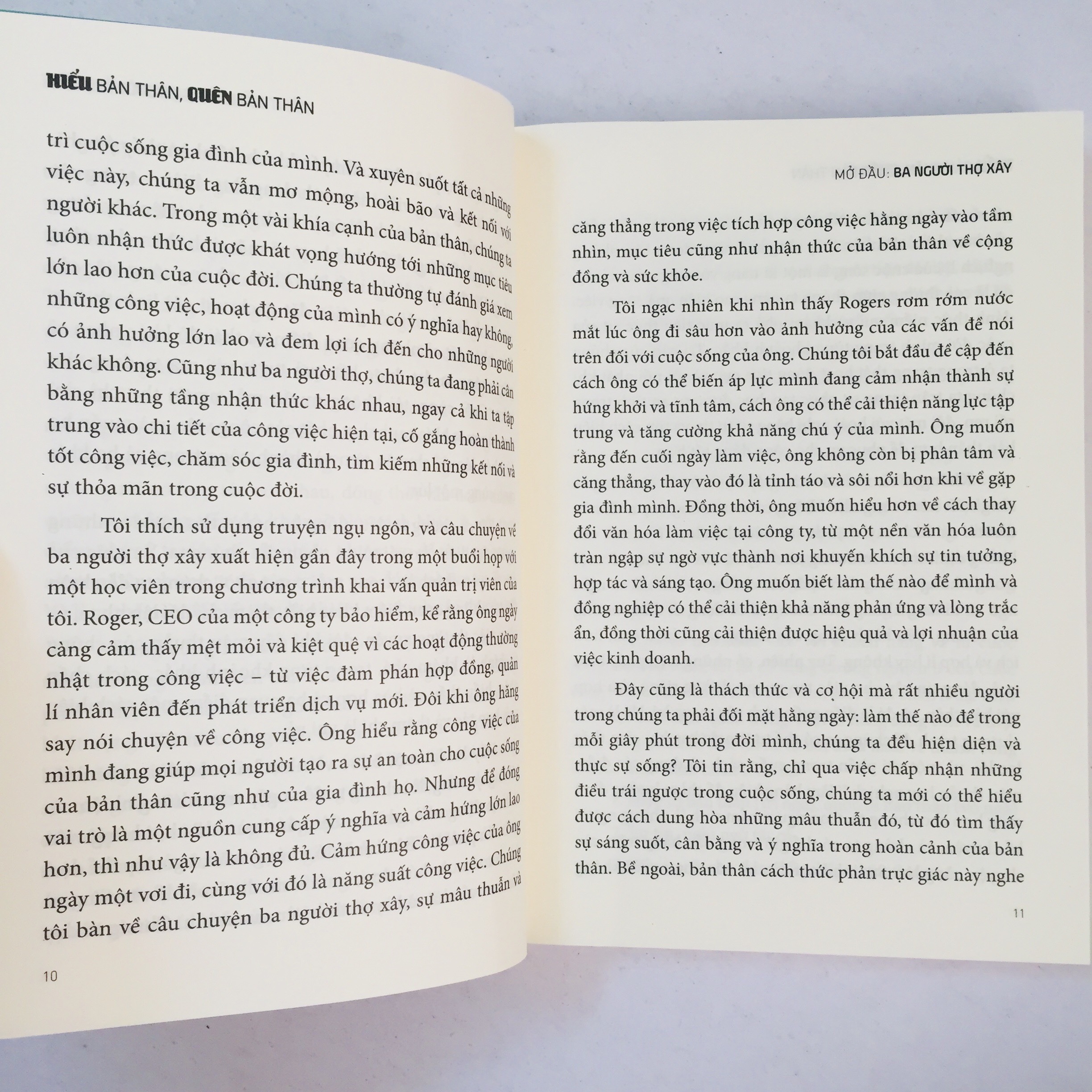 Dẫu ta luôn khao khát có được những câu trả lời rõ ràng cho muôn vàn rắc rối cuộc đời, hiếm khi nào ta có được chúng.  Trong cuốn sách này, Marc Lesser cho người đọc thấy rằng việc hiểu và trân trọng những thời điểm, những khoảnh khắc mà ở đó, cuộc đời mâu thuẫn nhất, khiến ta hoang mang nhất có thể mang lại cho ta nhiều niềm vui hơn, nhiều cảm giác thỏa mãn hơn.  “Hiểu bản thân, quên bản thân” mang đến những hướng dẫn rõ ràng, những bài thực hành đơn giản để ta có thể đón nhận những nghịch lí trọng tâm của cuộc đời, tận dụng chúng để tăng cường mức độ hiệu quả và hạnh phúc của chính mình.  Cuốn sách sẽ giúp bạn trau dồi những kĩ năng cảm xúc của bản thân, từ đó nắm vững con đường đúng đắn để vượt qua khó khăn và thử thách.  Cảm ơn bạn đã tham khảo cuốn sách này. Chúc một ngày tốt lành!